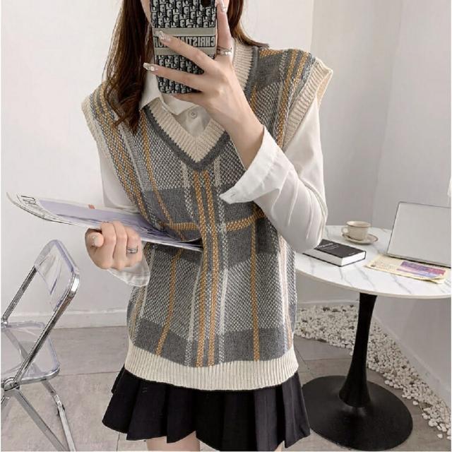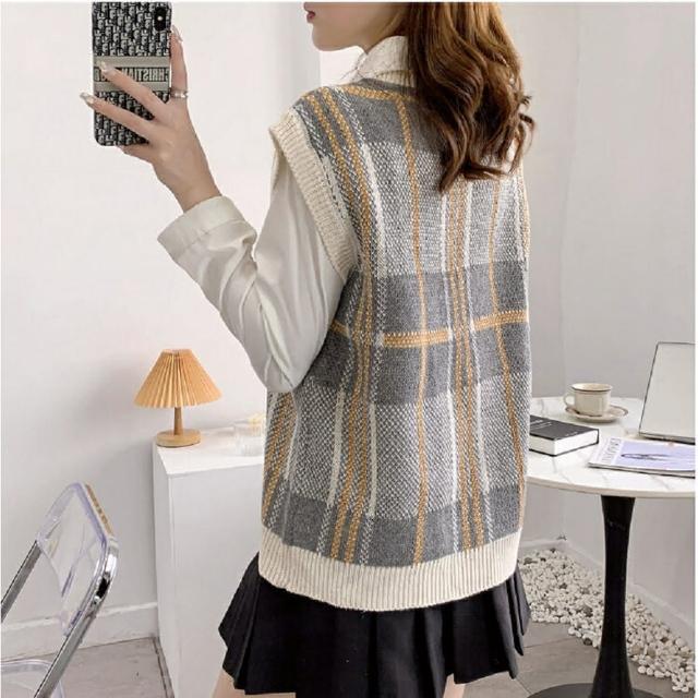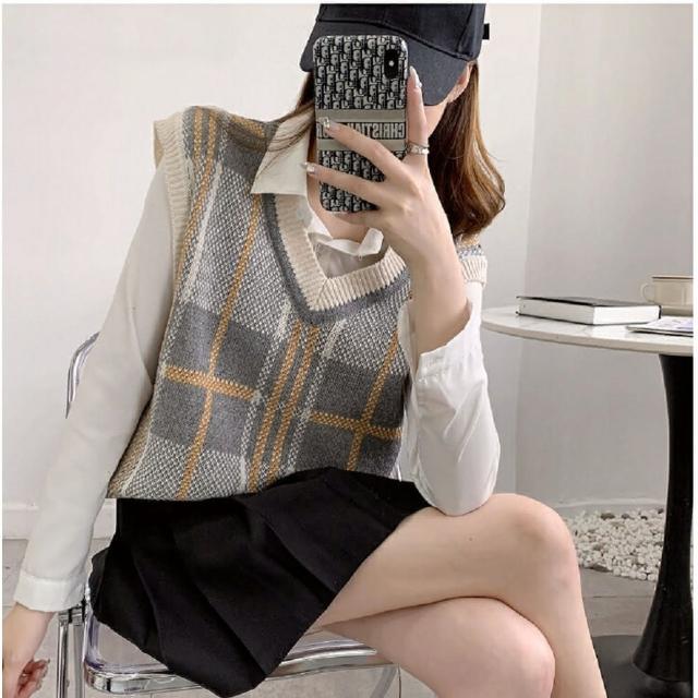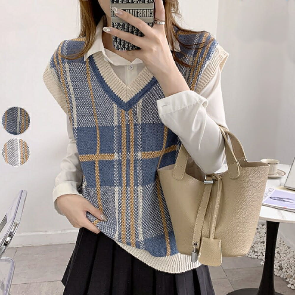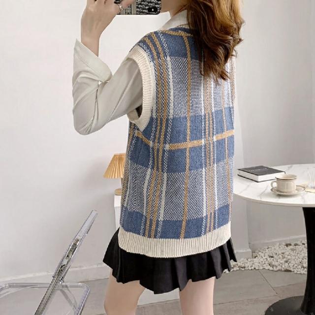 Shiny 藍格子復古格紋V領針織背心 V3656 現+預(女裝 毛衣 馬甲)