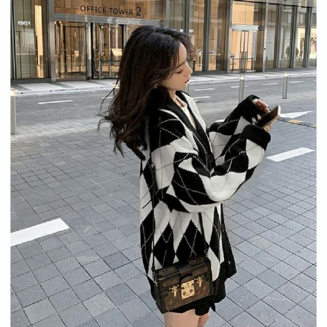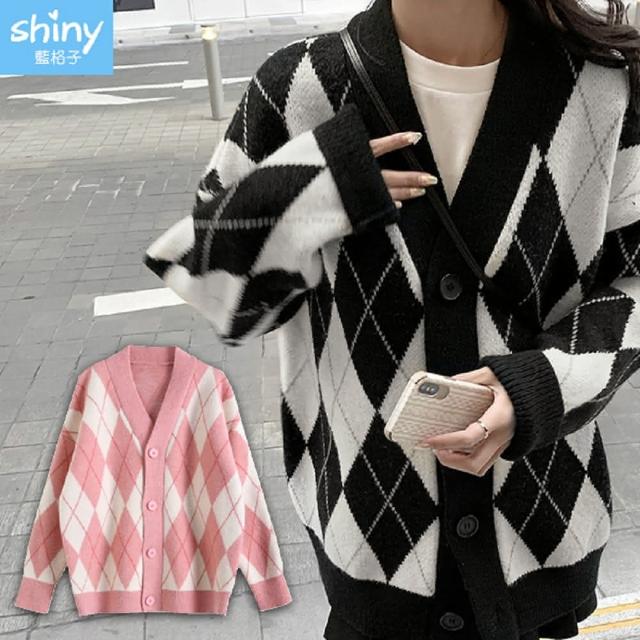 Shiny 藍格子復古慵懶菱形開衫中長款毛衣外套 V3650(女裝 針織 罩衫)
