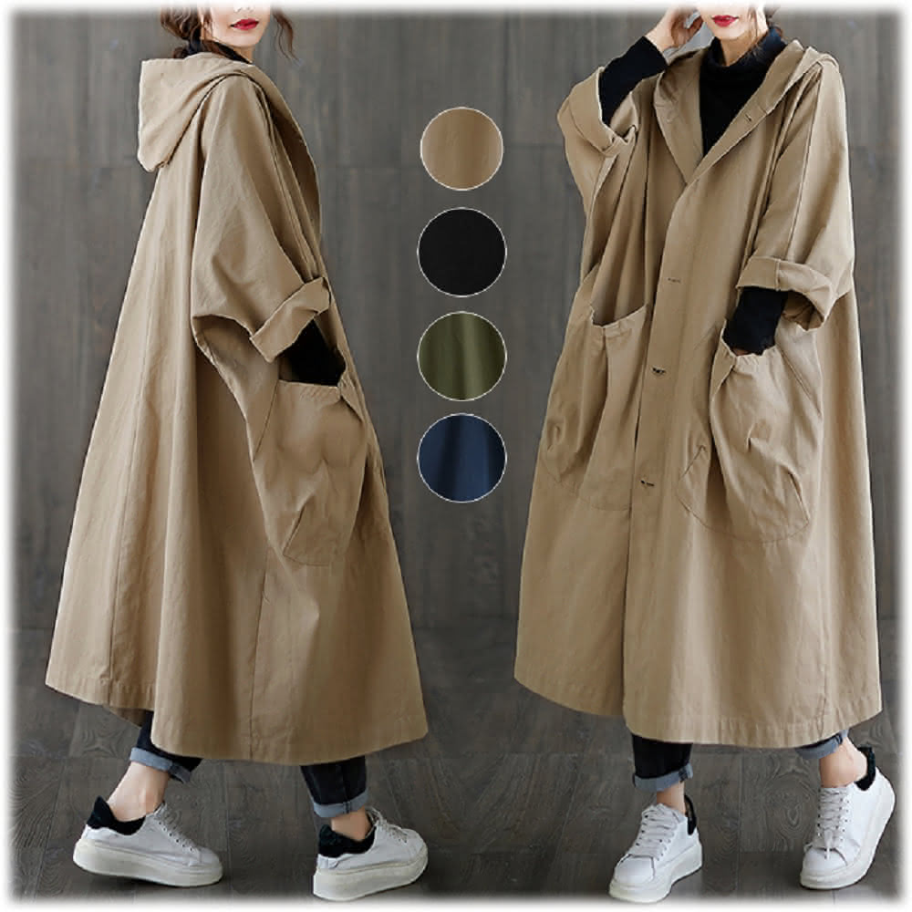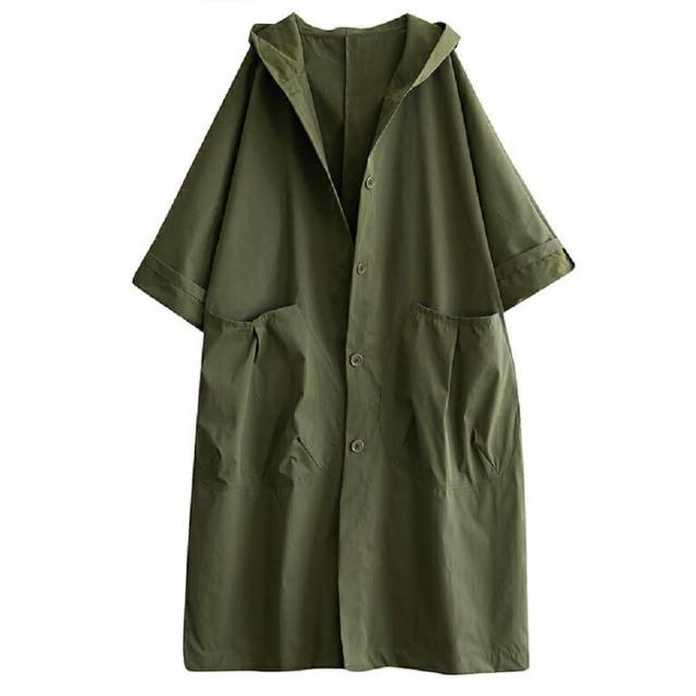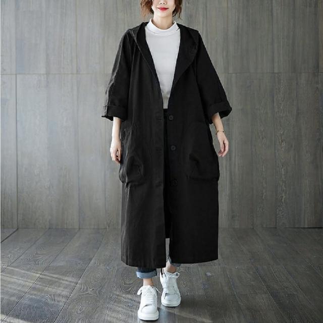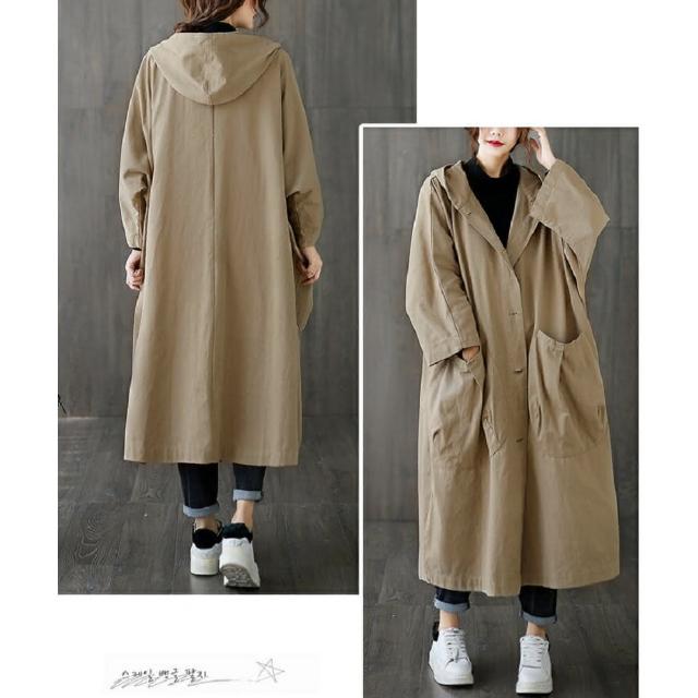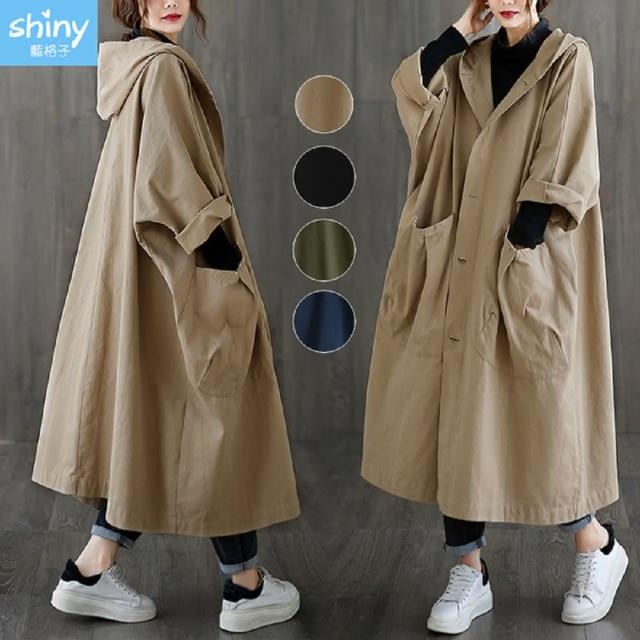 Shiny 藍格子純色寬版過膝長款排扣連帽風衣外套 V3890(女裝)
