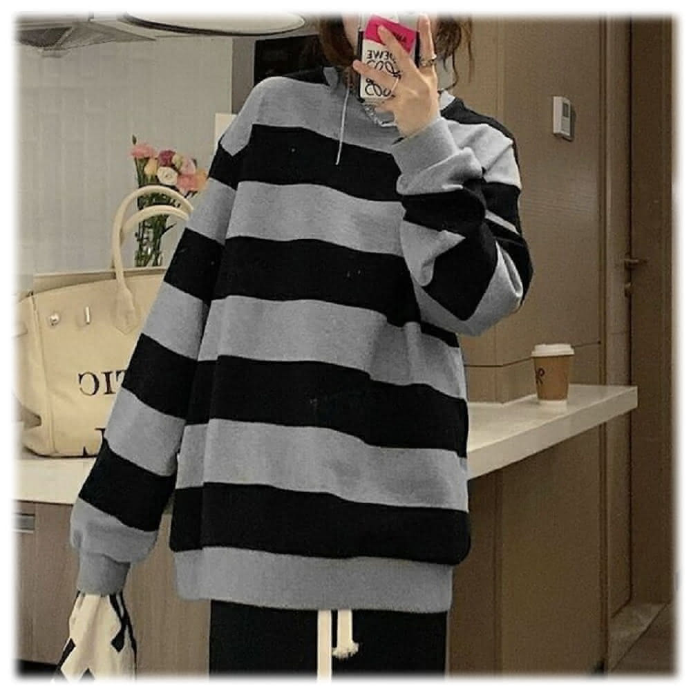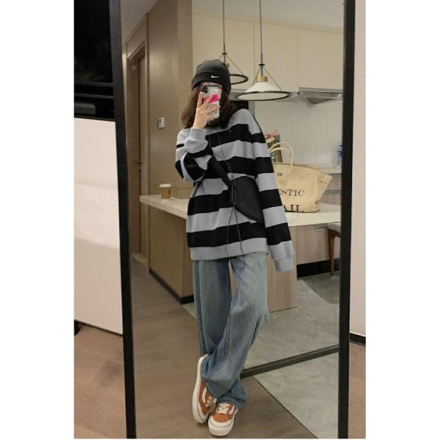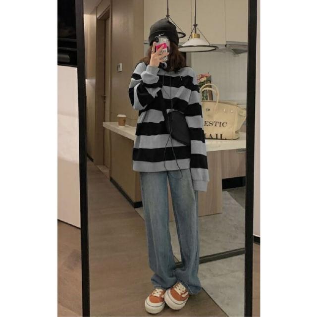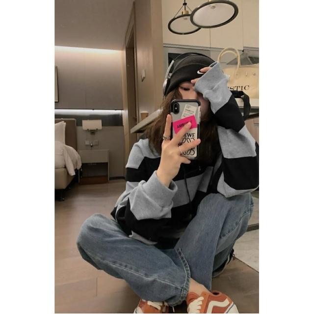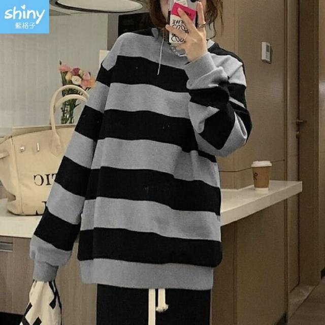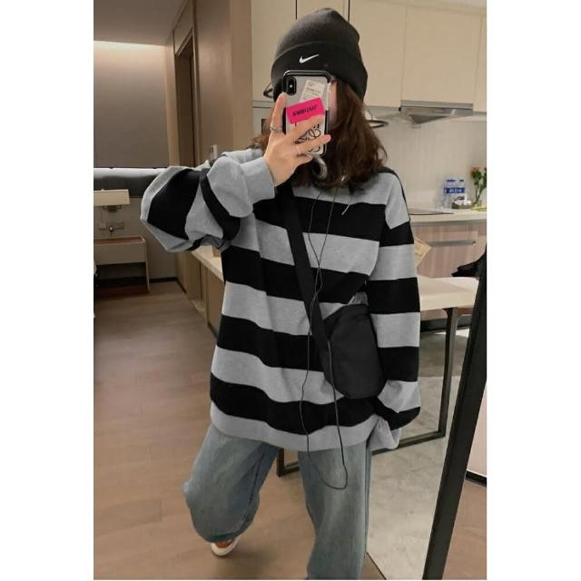 Shiny 藍格子黑灰寬條紋寬鬆圓領長袖上衣 V3920(女裝 T恤)