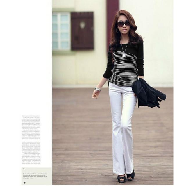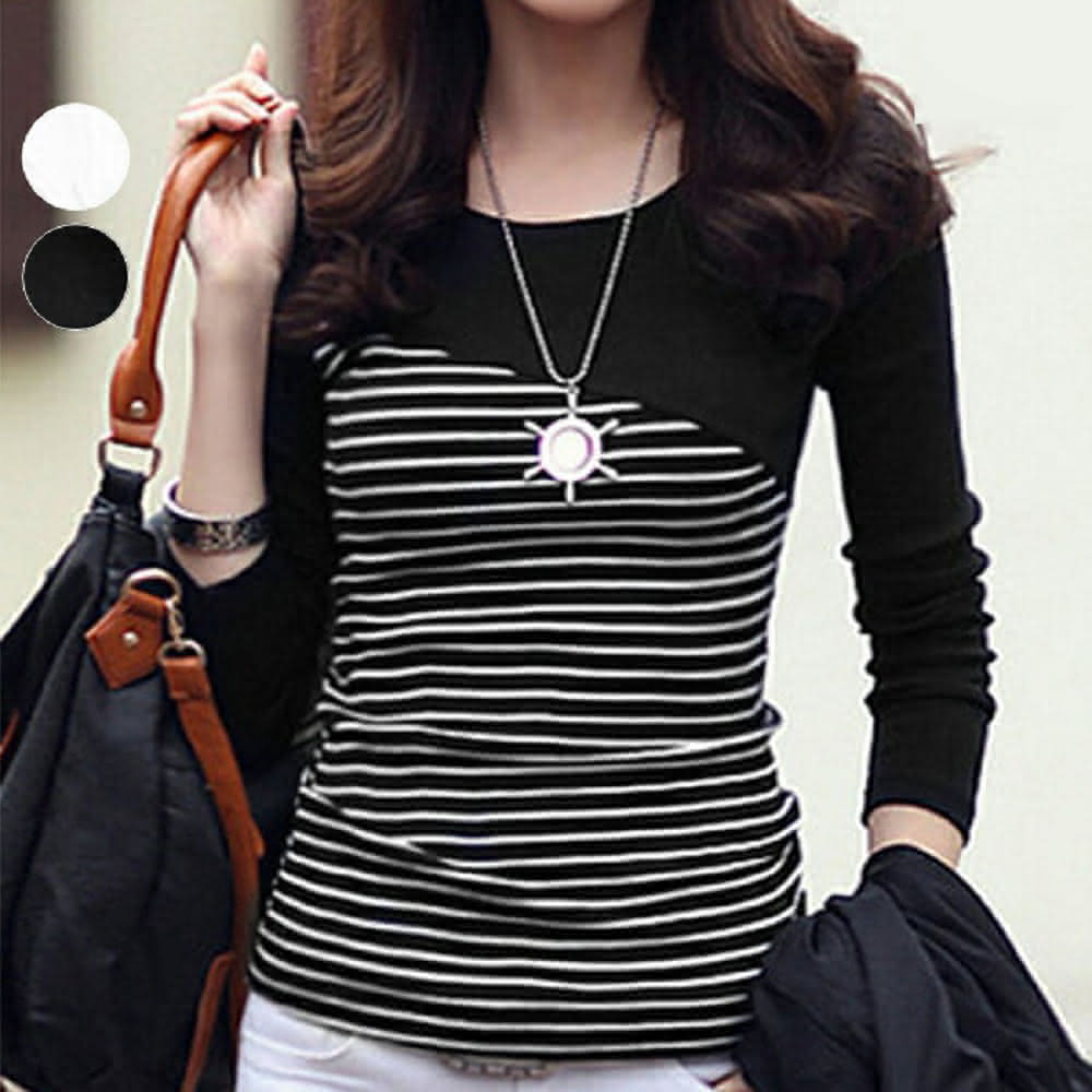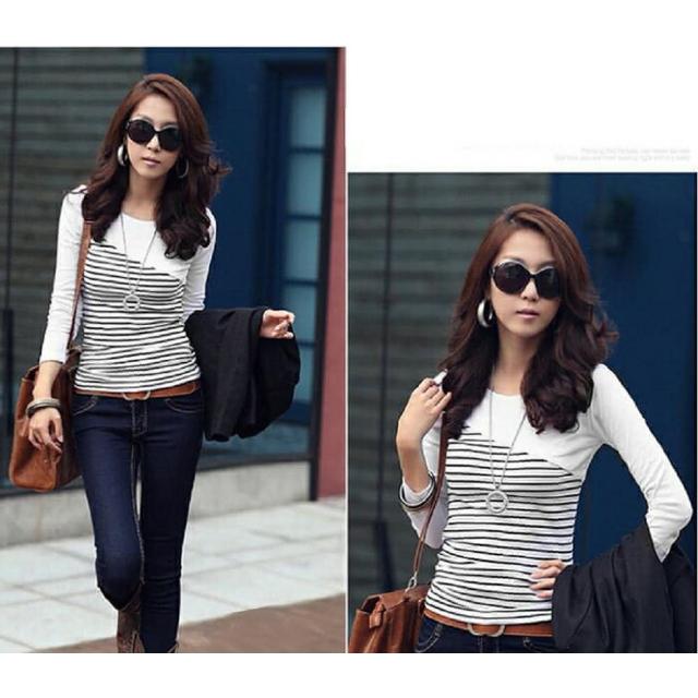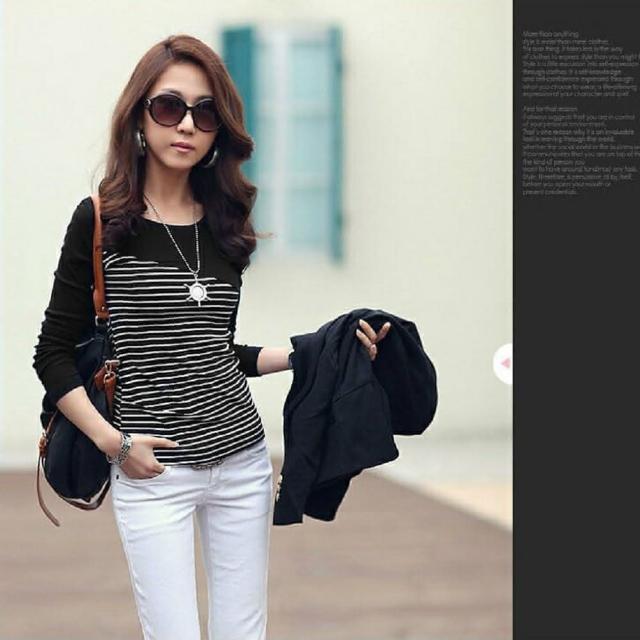 Shiny 藍格子條紋拼接撞色長袖上衣 V3915(女裝 T恤)