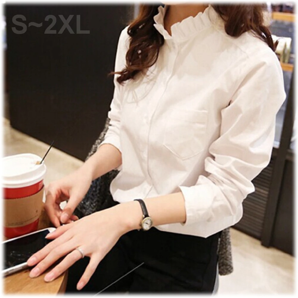 Shiny 藍格子純色甜美花瓣領寬鬆長袖襯衫上衣 V0209(女裝)