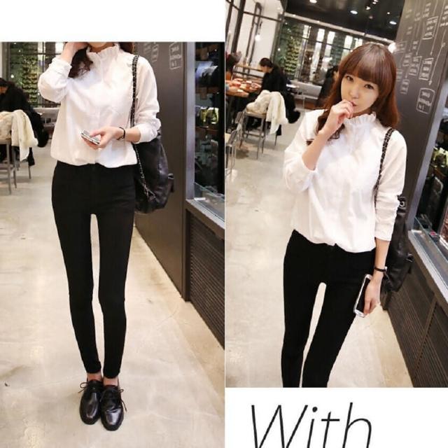 Shiny 藍格子純色甜美花瓣領寬鬆長袖襯衫上衣 V0209(女裝)
