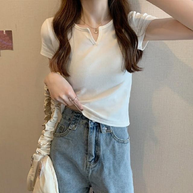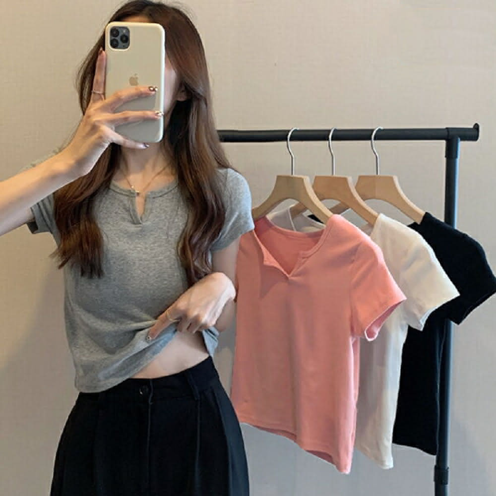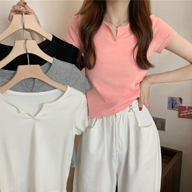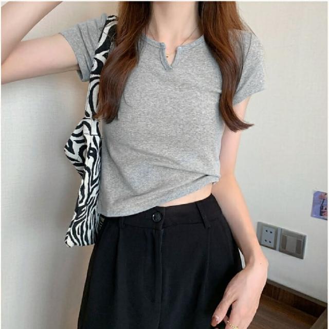 Shiny 藍格子素面小V領露肚露肚短袖上衣 V3528(女裝 T恤)