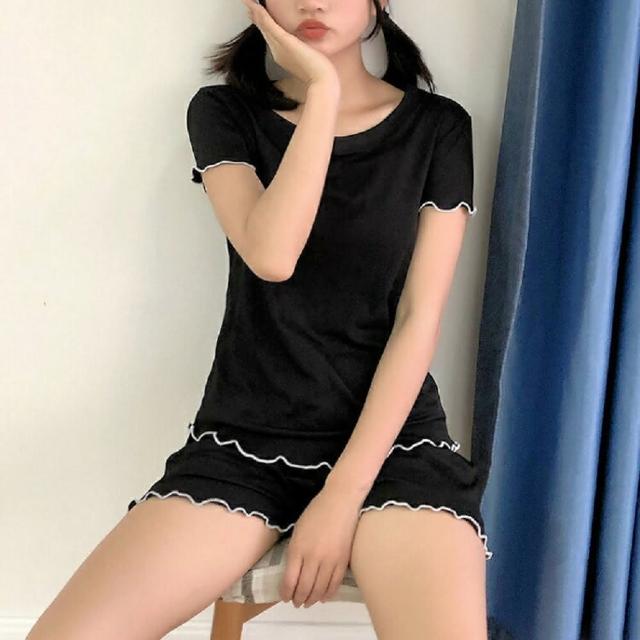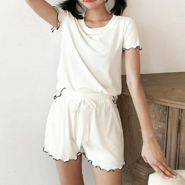 Shiny 藍格子純色木耳邊短袖上衣+鬆緊腰短褲套裝 V3810 現+預(女裝 二件式)