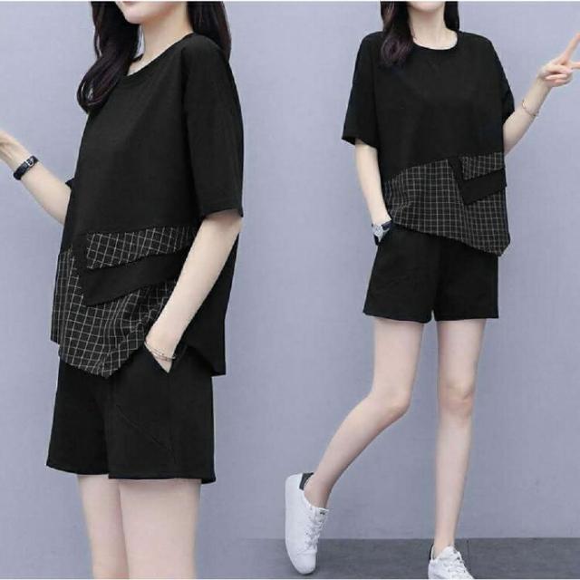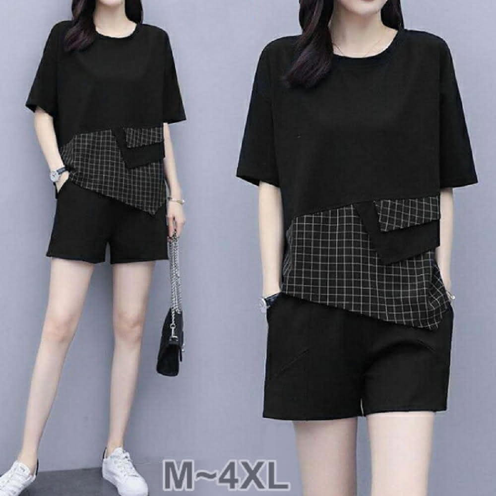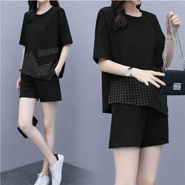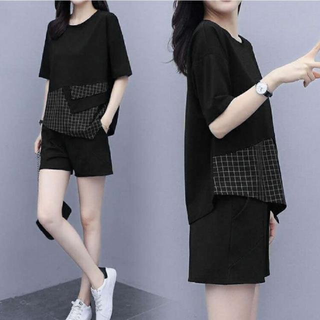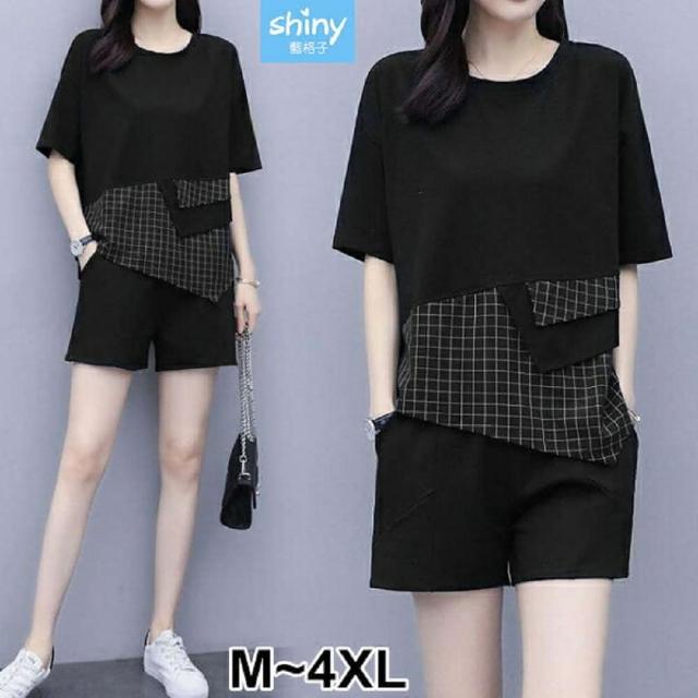 Shiny 藍格子格紋拼接圓領短袖上衣+鬆緊腰短褲套裝 V3781 現+預(女裝 二件式)