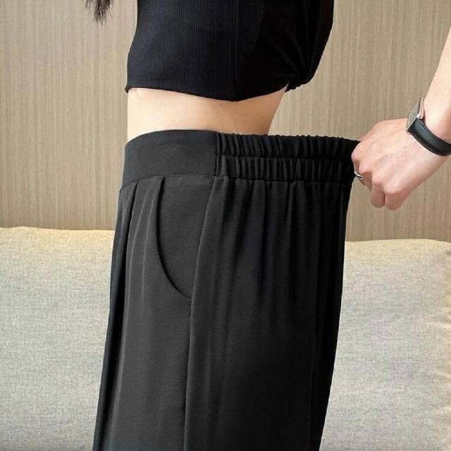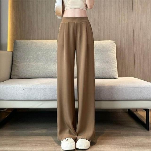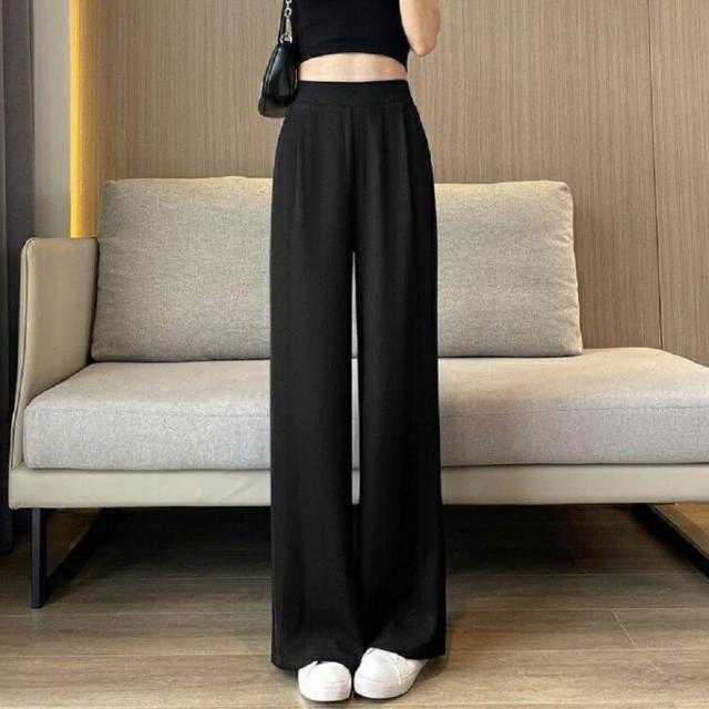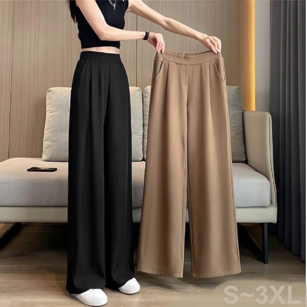 Shiny 藍格子純色後鬆緊高腰垂感寬鬆直筒褲 V3980