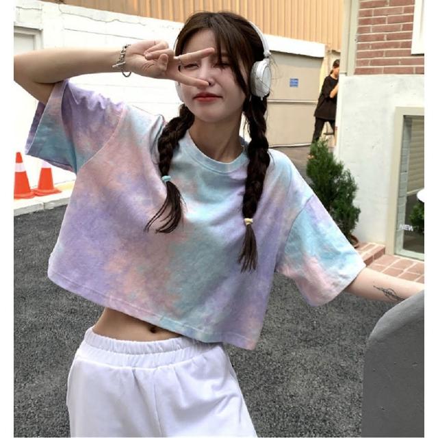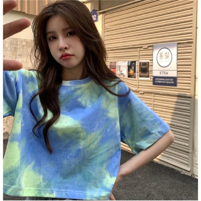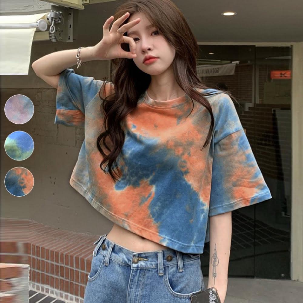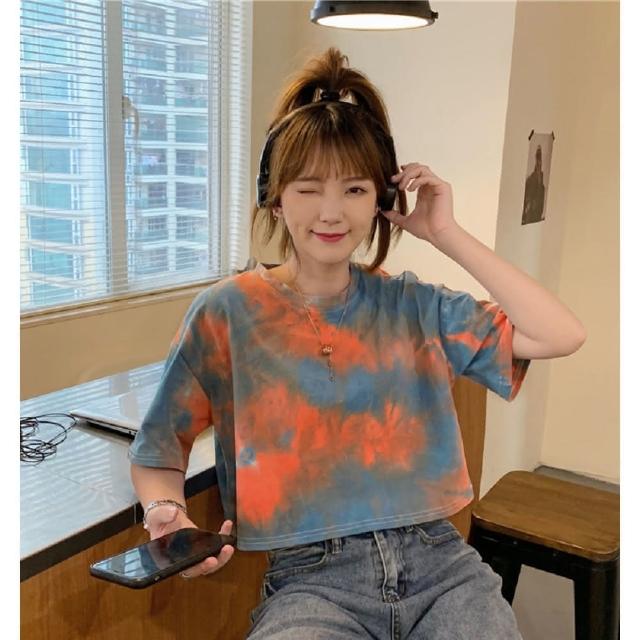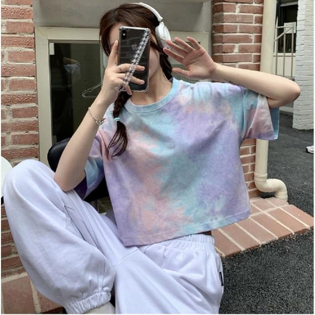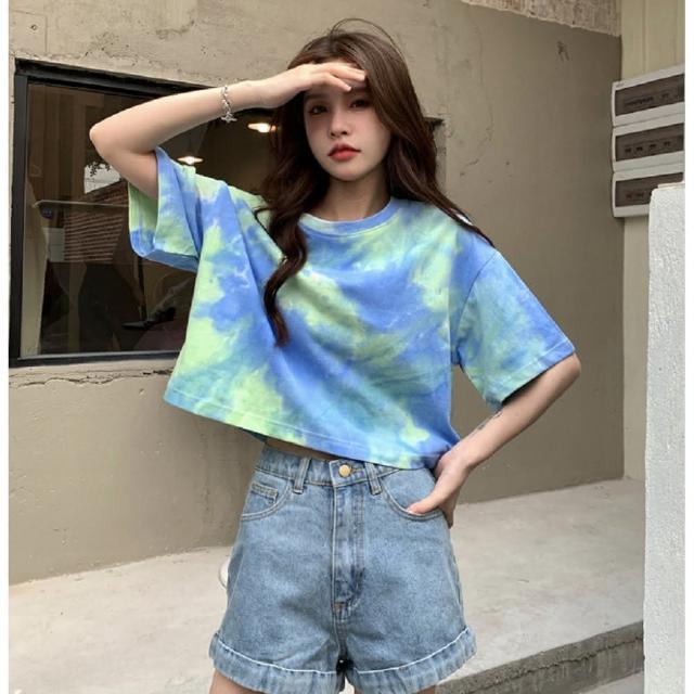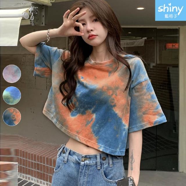 Shiny 藍格子彩色暈染露肚短版圓領短T V3985(女裝 上衣)