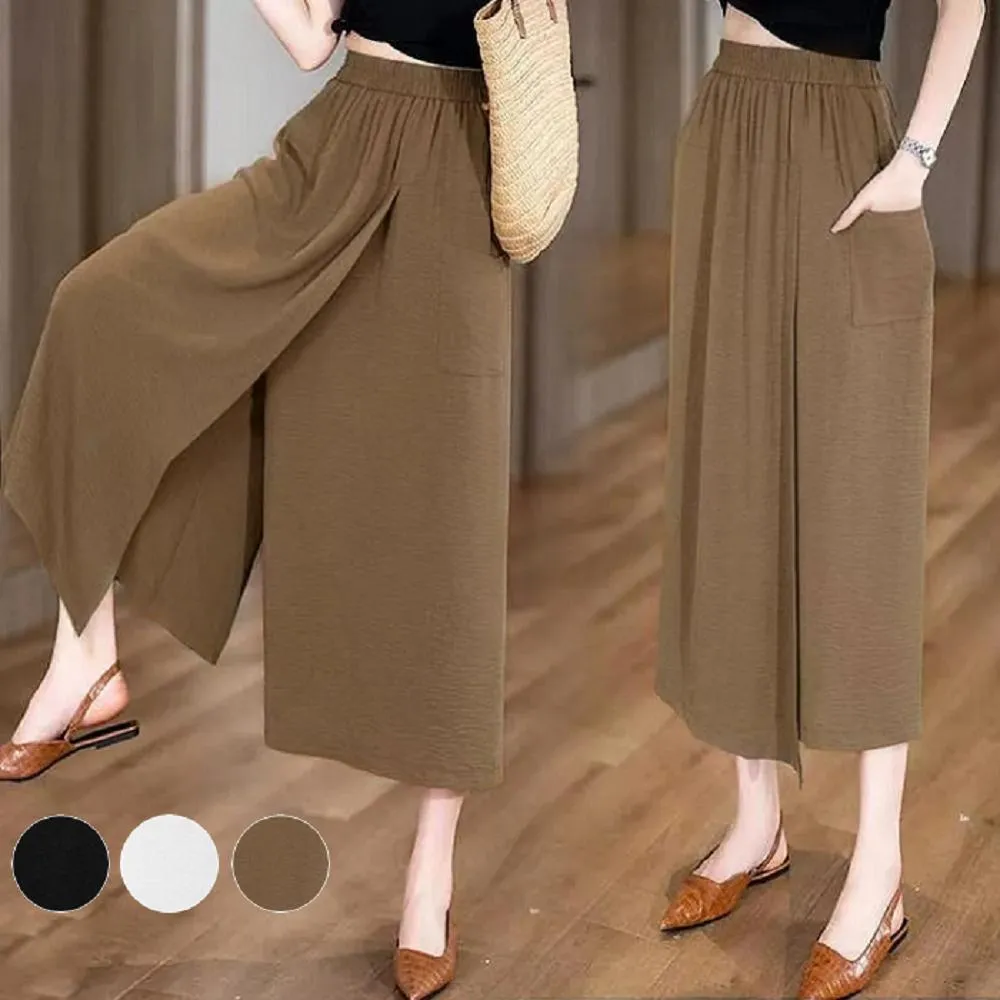 Shiny 藍格子純色鬆緊高腰開叉八分闊腿褲裙 V3991(女褲 寬褲 裙子)