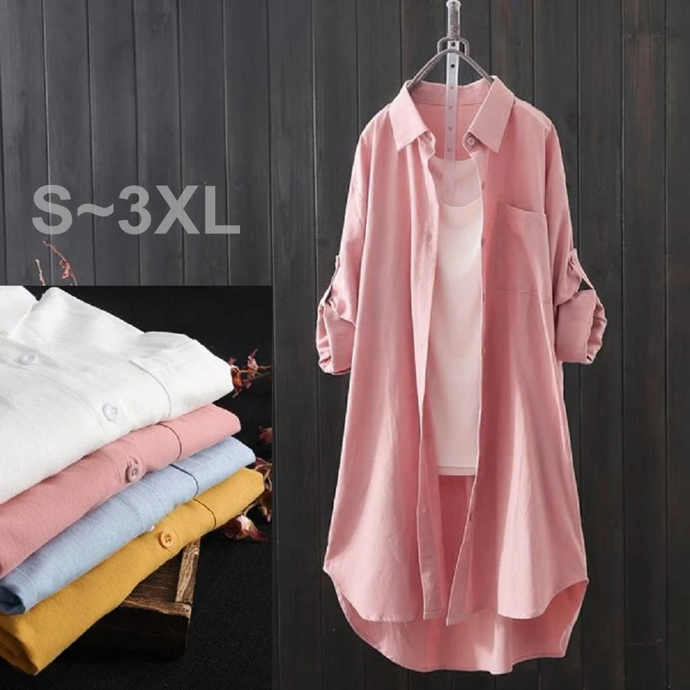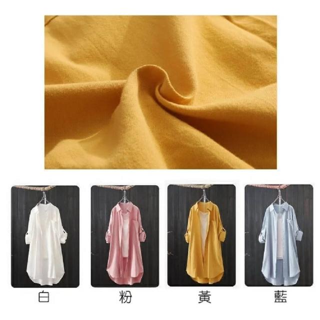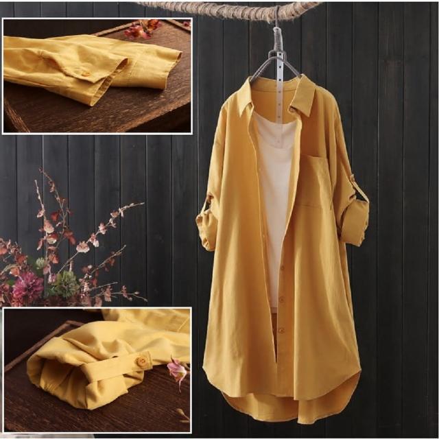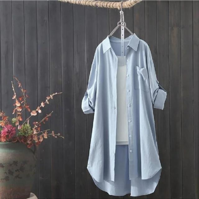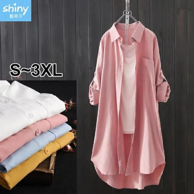 Shiny 藍格子素色單口袋長版長袖襯衫外套 V3999(女裝 上衣)
