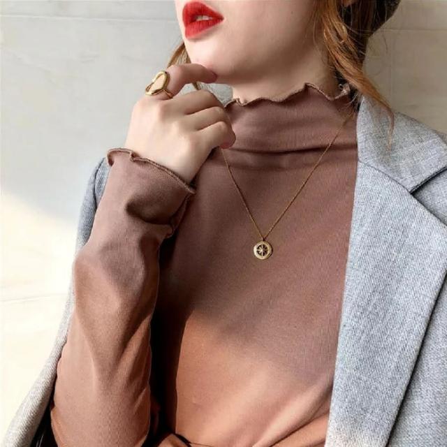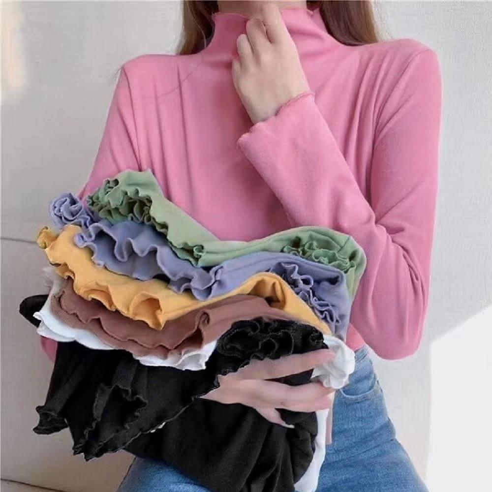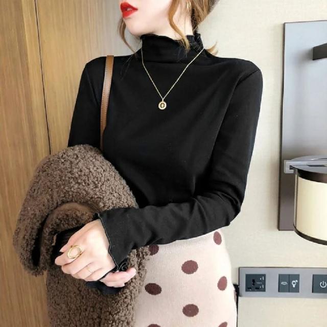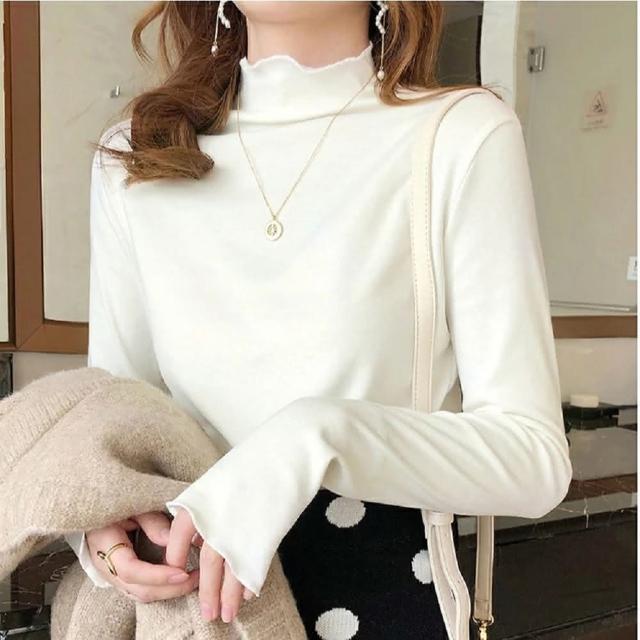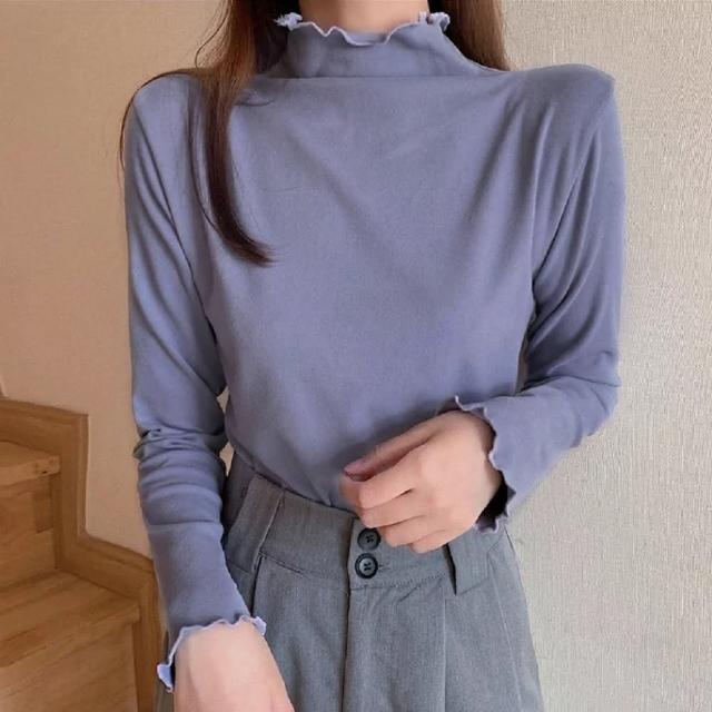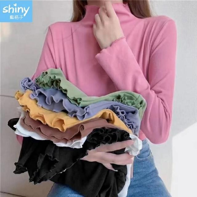 Shiny 藍格子素色柔軟木耳邊半高領長袖上衣 V3939(女裝 T恤 內搭)