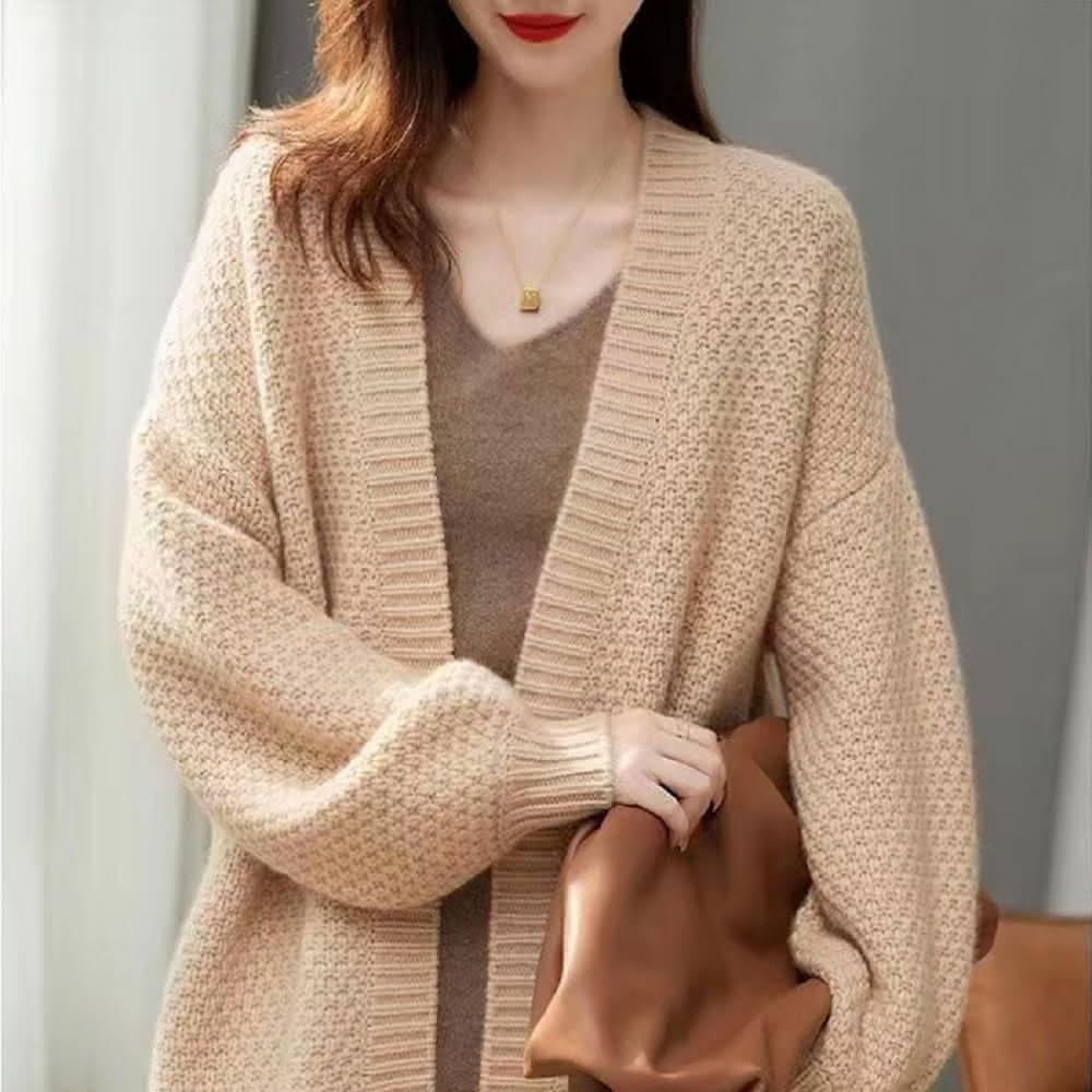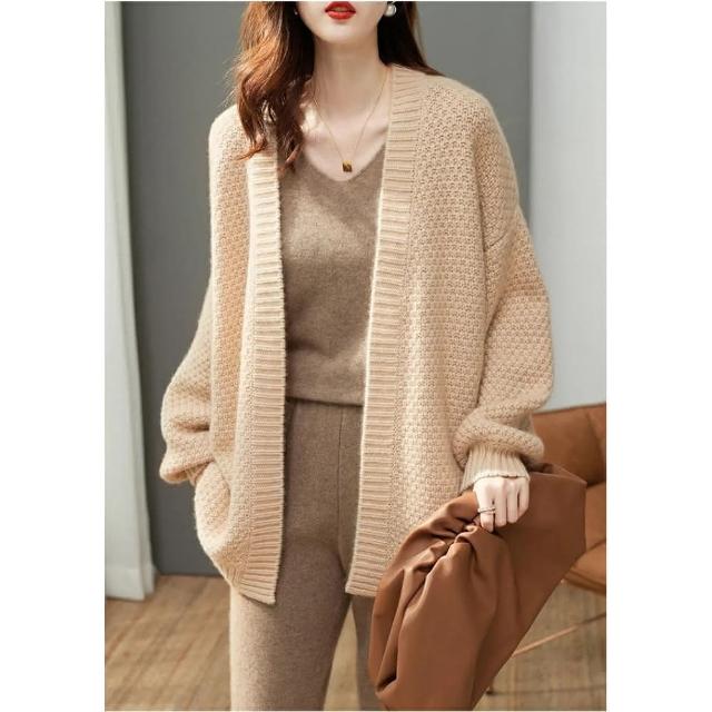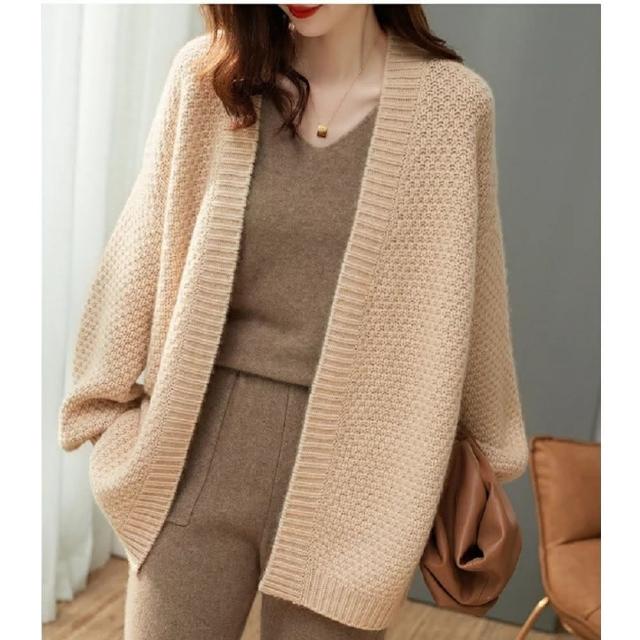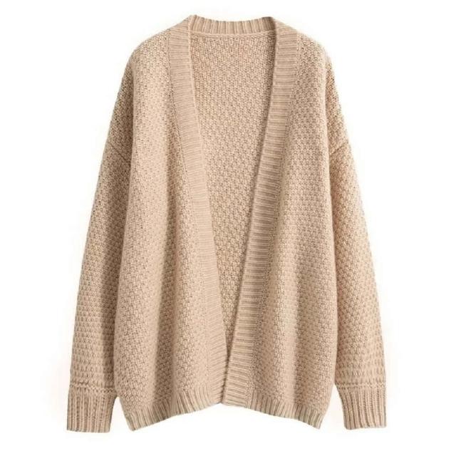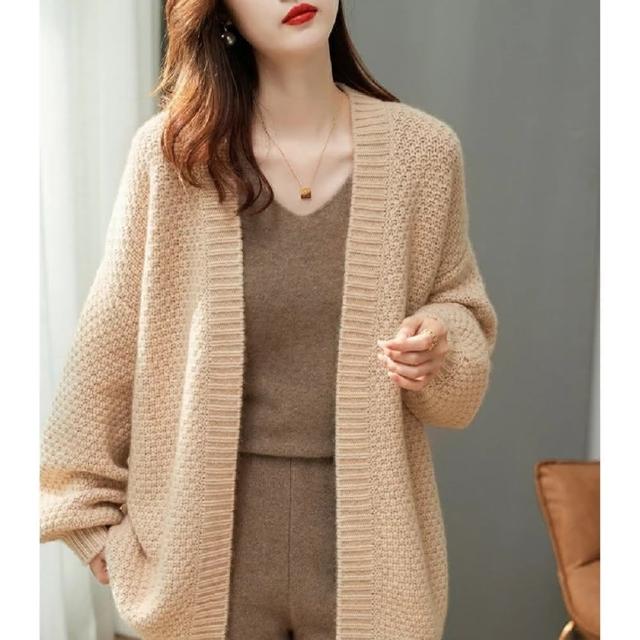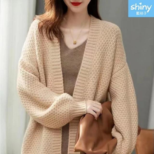 Shiny 藍格子百搭純色無扣寬鬆中長款針織毛衣外套 V3895(女裝 毛衣 罩衫)