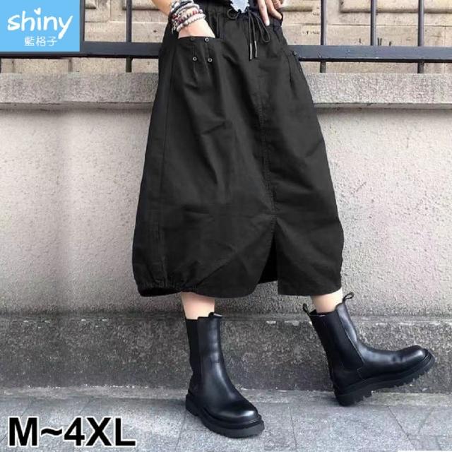 Shiny 藍格子素色前開叉抽繩鬆緊腰A字裙 V5022(女裝 裙子 長裙)