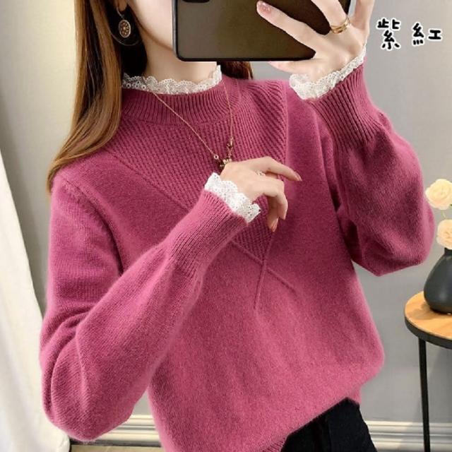 Shiny 藍格子素色蕾絲拼接半高領長袖針織衫 V3940(女裝 毛衣)