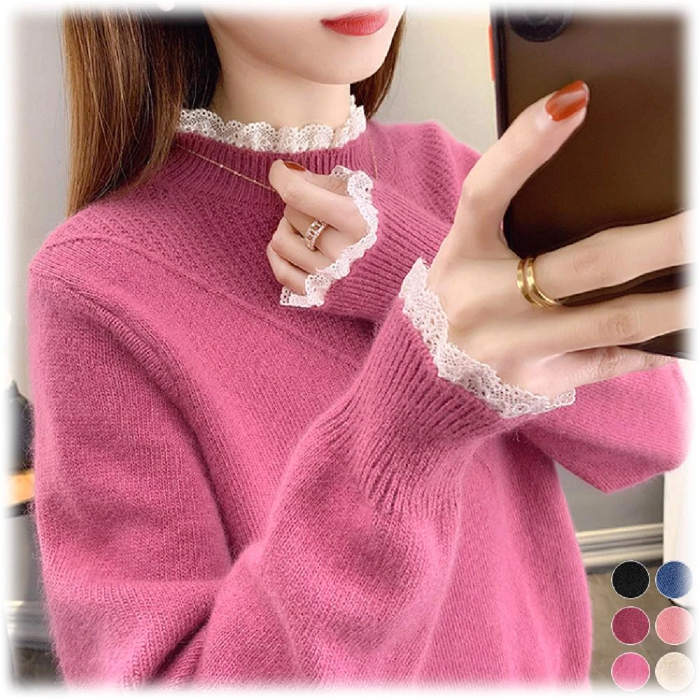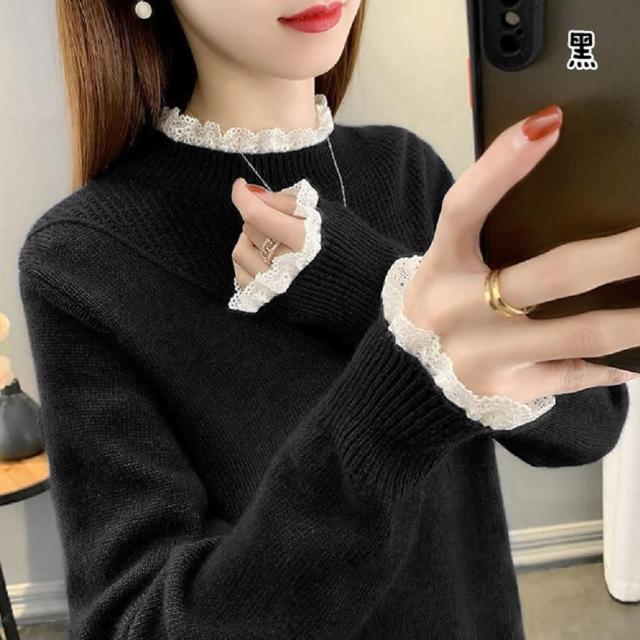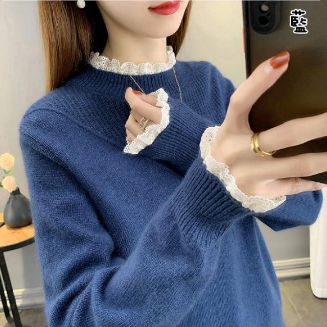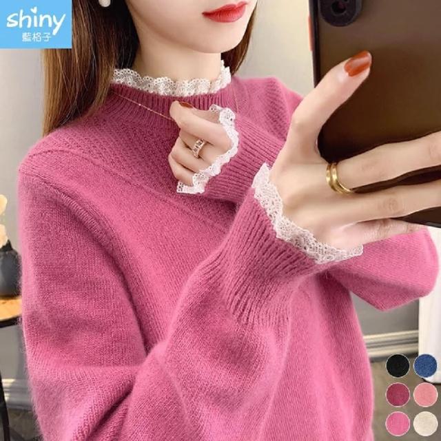 Shiny 藍格子素色蕾絲拼接半高領長袖針織衫 V3940(女裝 毛衣)