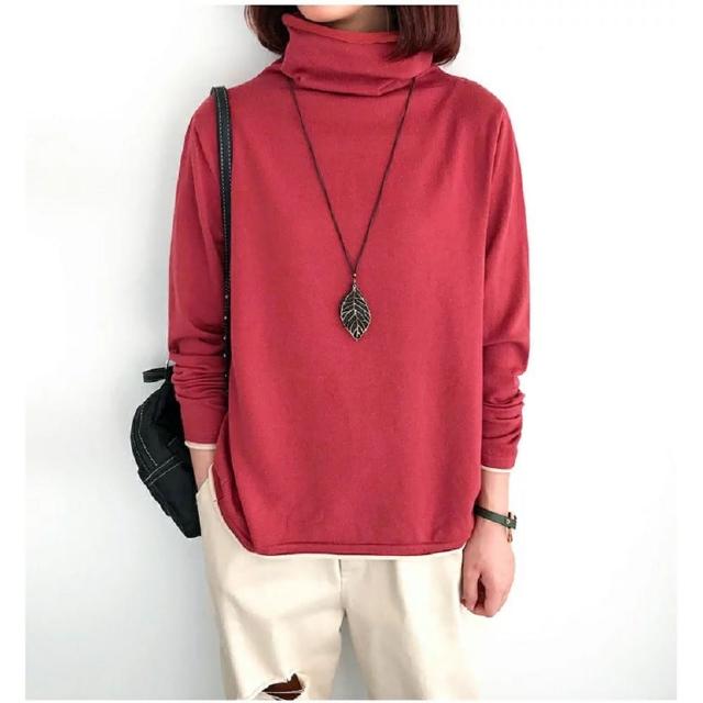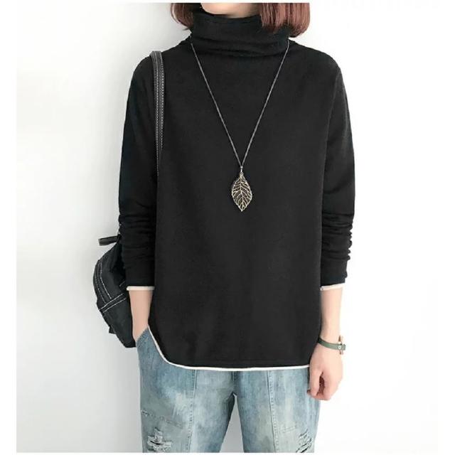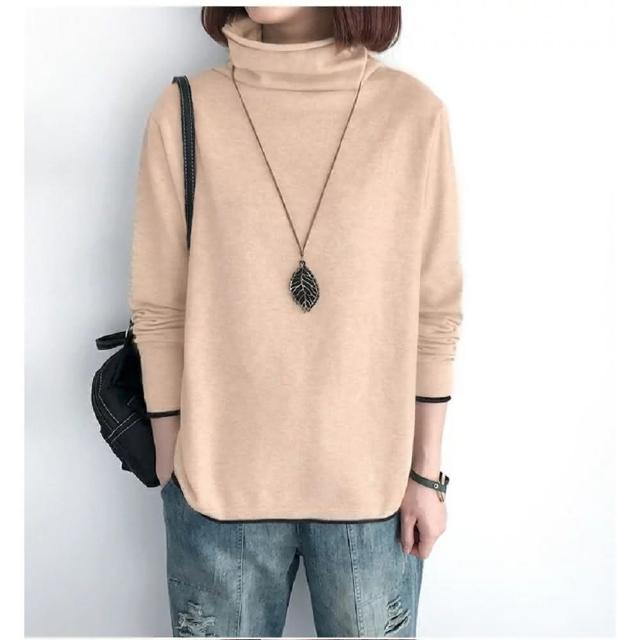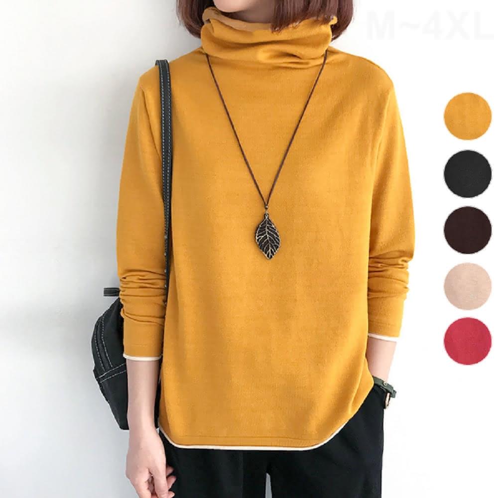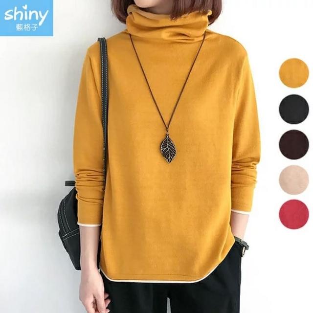 Shiny 藍格子修身顯瘦素面撞色高領德絨長袖上衣 V3935(女裝 T恤)