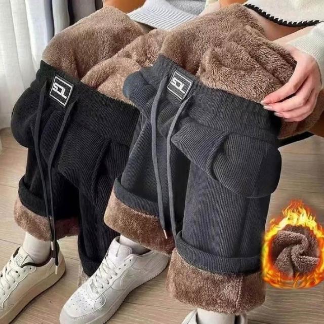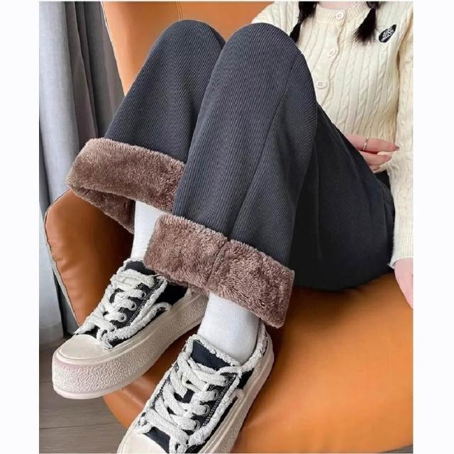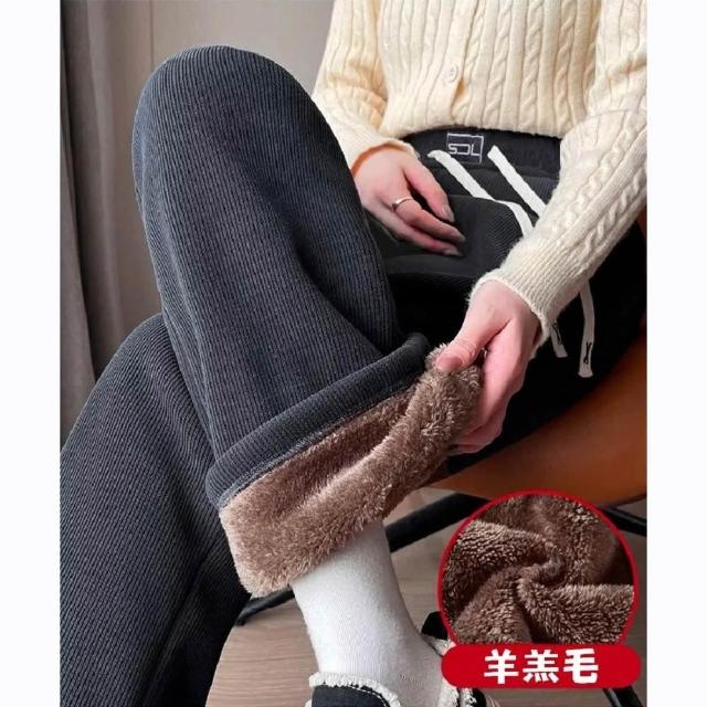 Shiny 藍格子加絨加厚貼標抽繩鬆緊腰直筒褲 V5032(女褲 羊羔毛 刷毛)