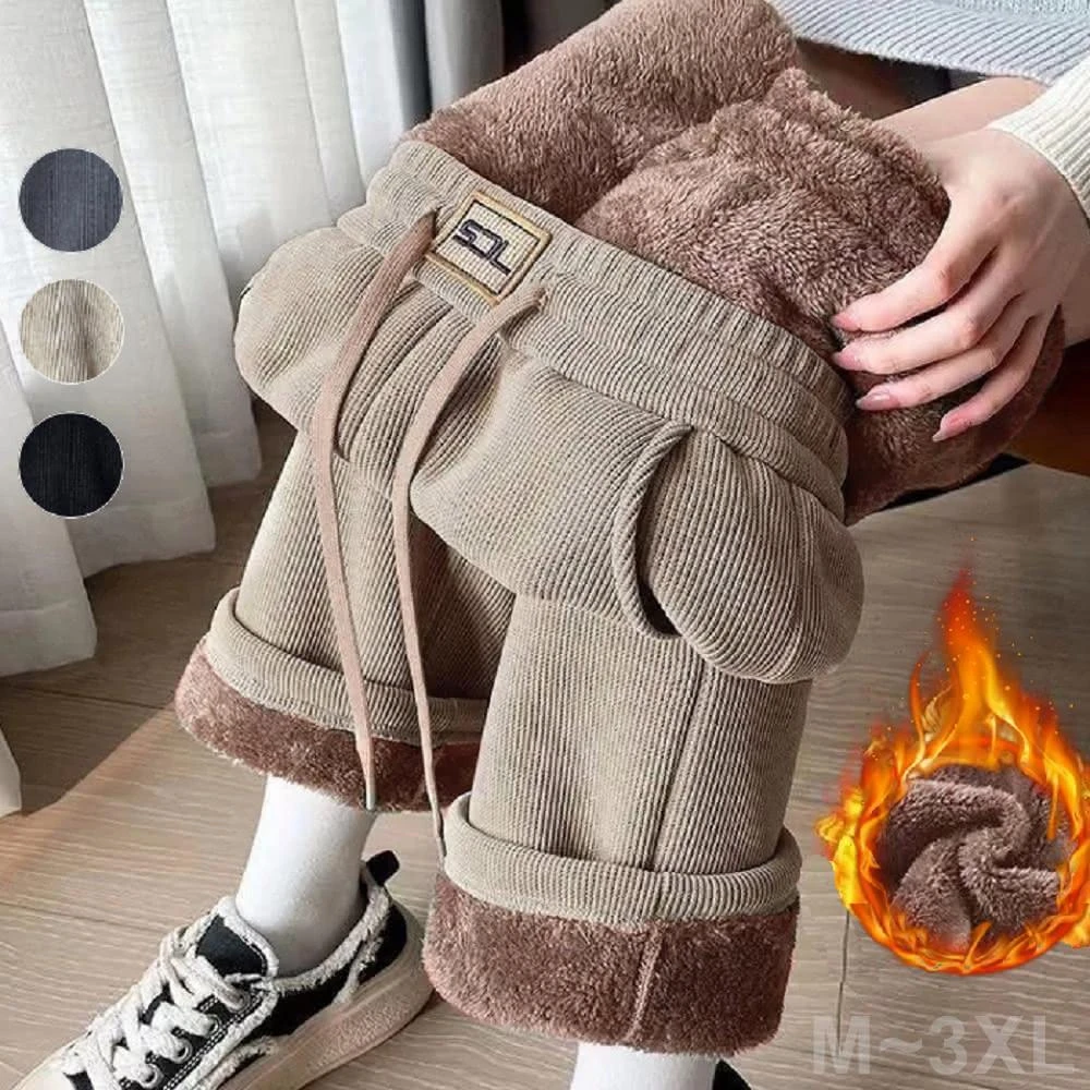 Shiny 藍格子加絨加厚貼標抽繩鬆緊腰直筒褲 V5032(女褲 羊羔毛 刷毛)