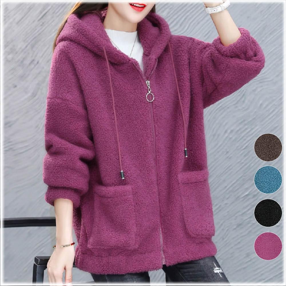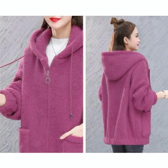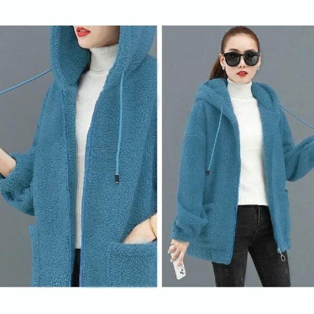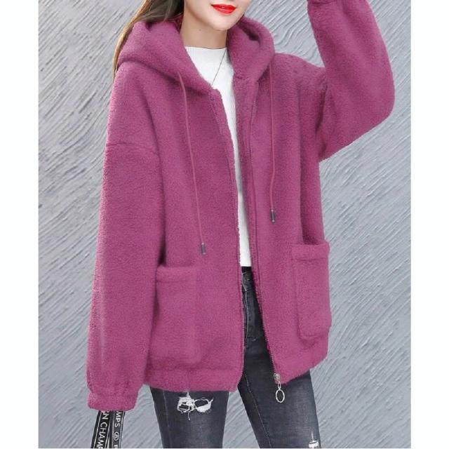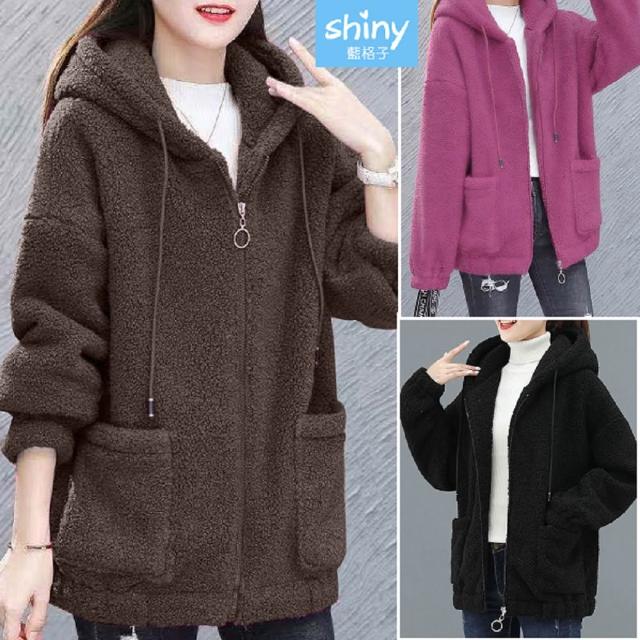 Shiny 藍格子純色羊羔毛寬鬆連帽外套 V3482(女裝)