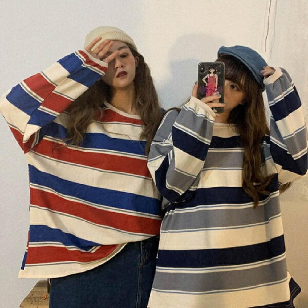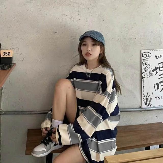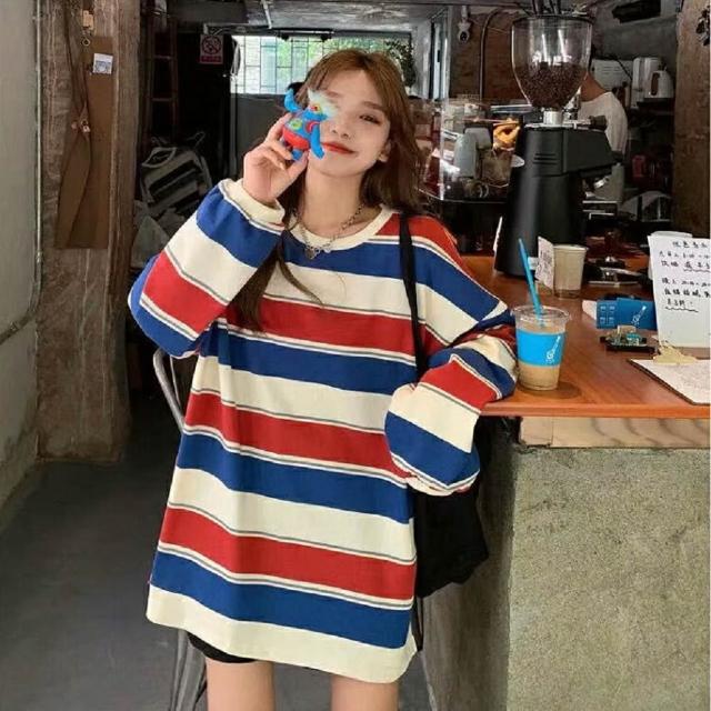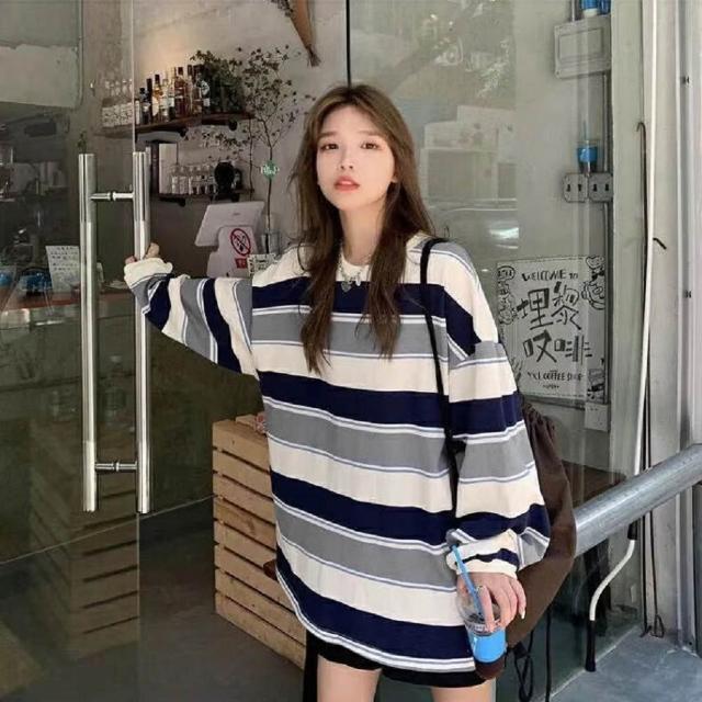 Shiny 藍格子撞色條紋圓領寬鬆長袖T恤上衣 V3666(女裝)