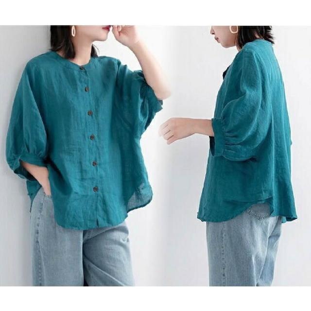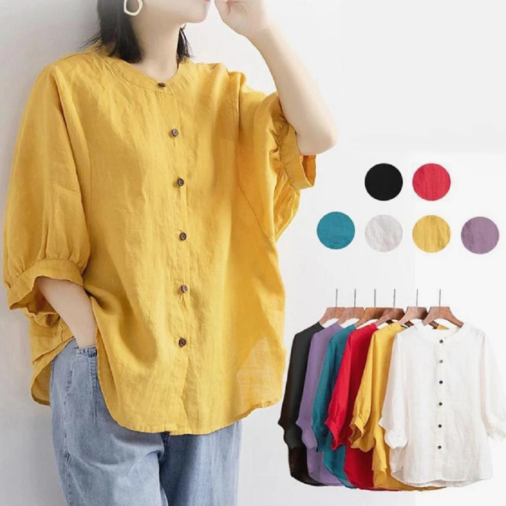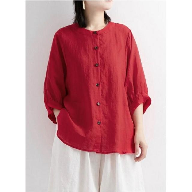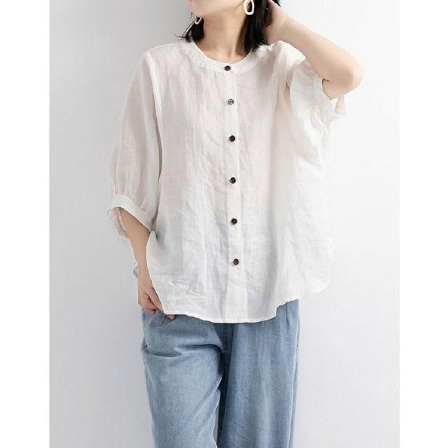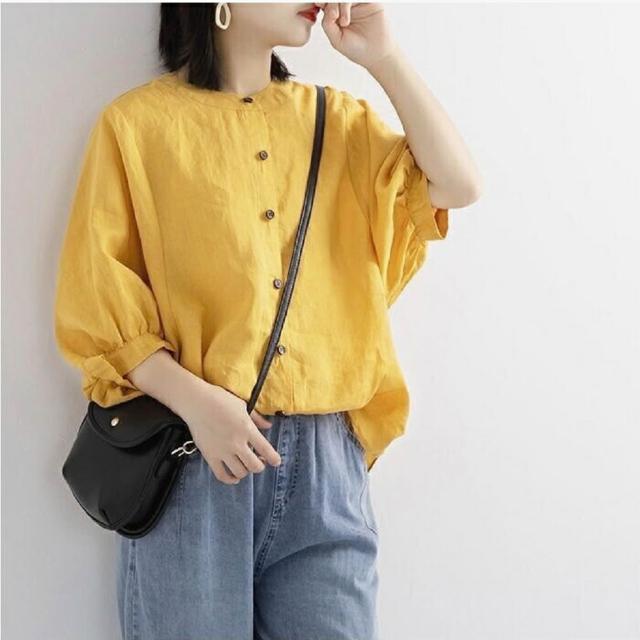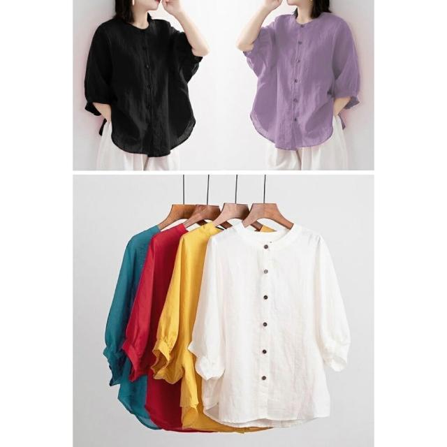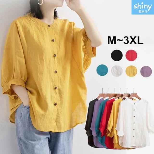 Shiny 藍格子文藝純色寬鬆燈籠袖棉麻襯衫 V3844(女裝)