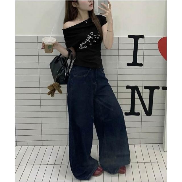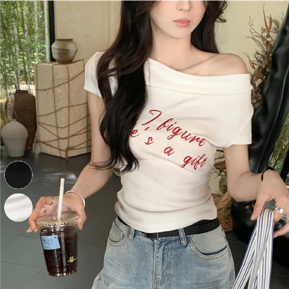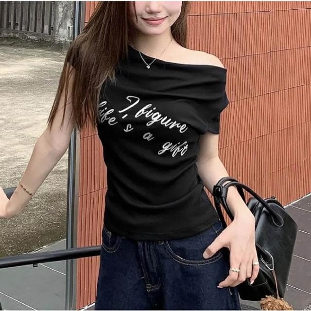 Shiny 藍格子字母印花一字領修身辣妹短T V5072(女裝 上衣 短袖)