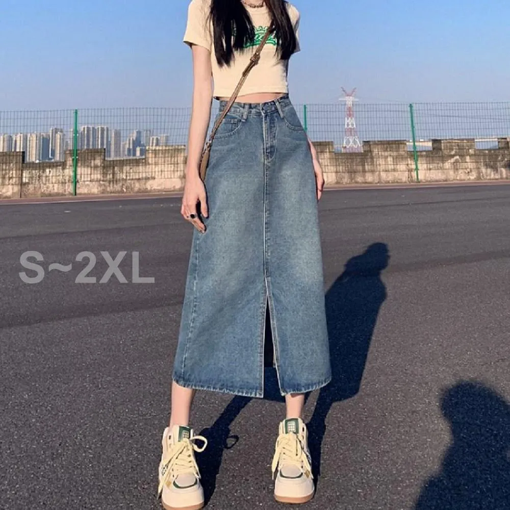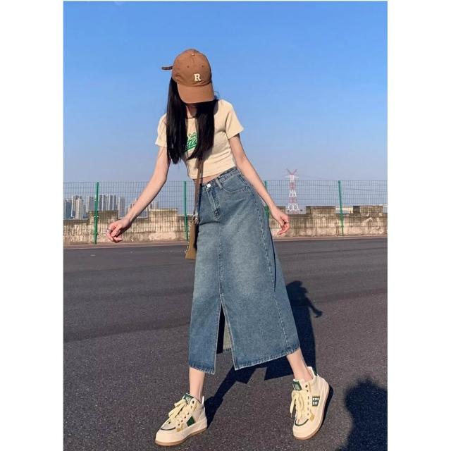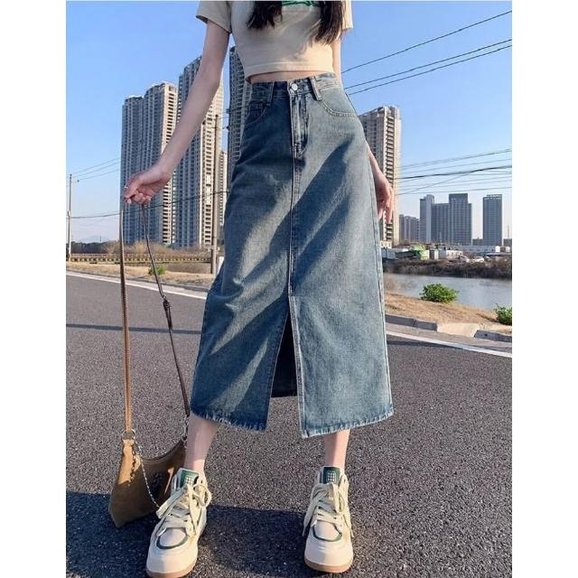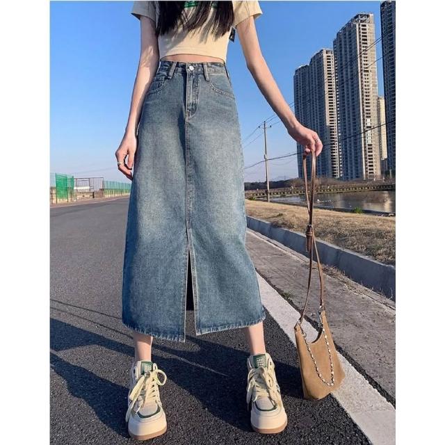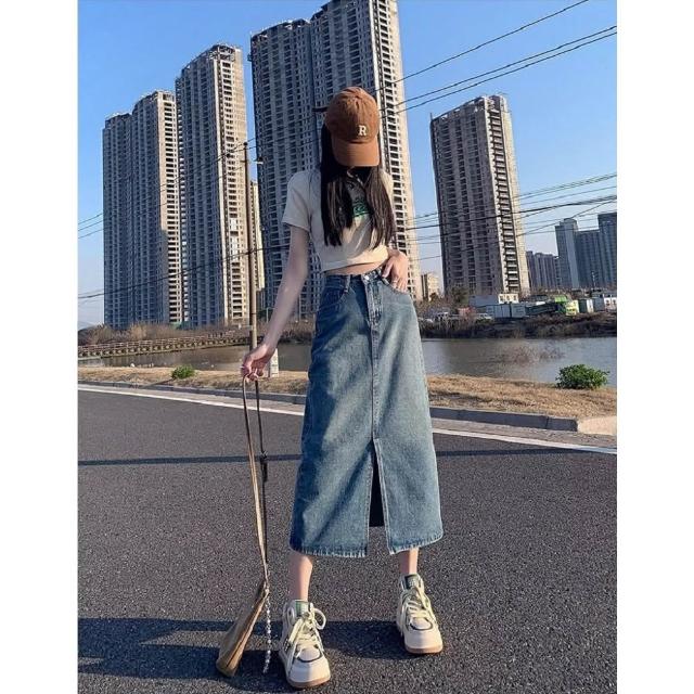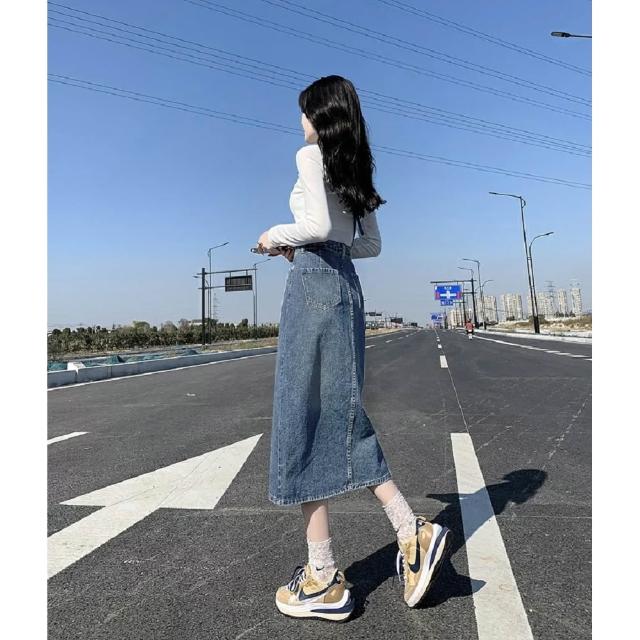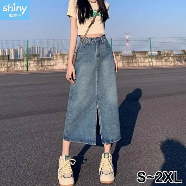 Shiny 藍格子高腰包臀前開叉中長款牛仔A字裙 V5144(裙子 單寧 長裙)