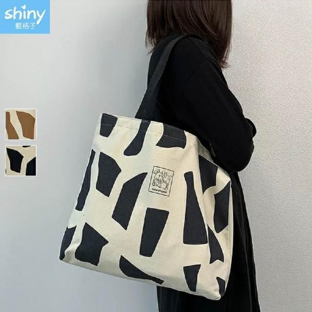 Shiny 藍格子文藝大容量單肩手提帆布袋包 P362(女包 包包 方包)