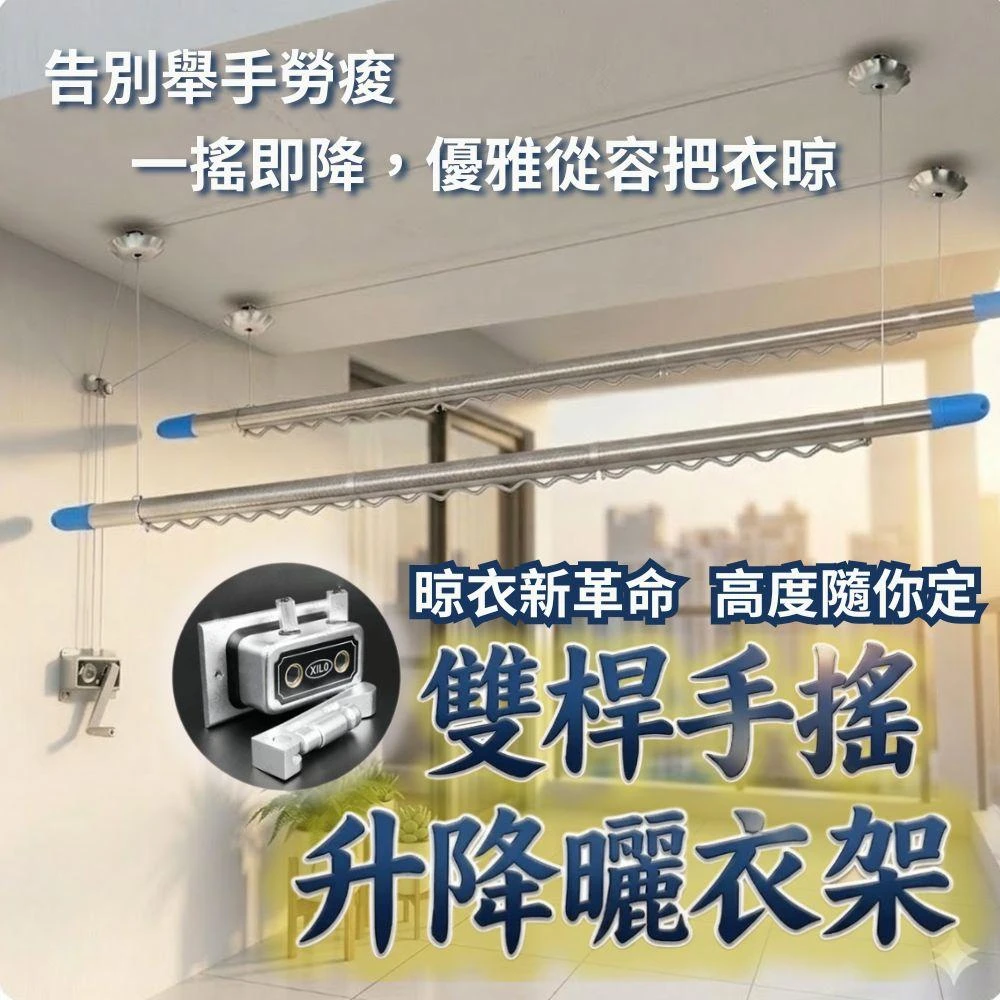 手搖雙桿式升降曬衣架 含3米伸縮桿(手搖式升降曬衣架/晾衣架/曬衣桿/伸縮桿)
