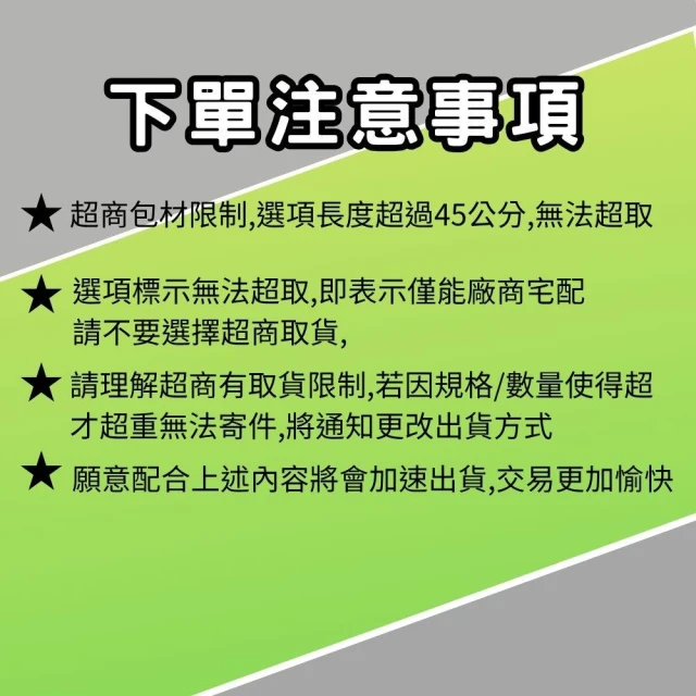 - 針對大型商品(包括:大型家電、家具床墊、健身按摩器材、車類...等),商店將於完成收款確認後,一天內〈不含例假日〉將會有專人與您確認相關配送細節等的聯繫。偏遠地區、樓層費及其它加價費用,皆由商店於約定配送時一併告知,商店將保留出貨與否的權利。