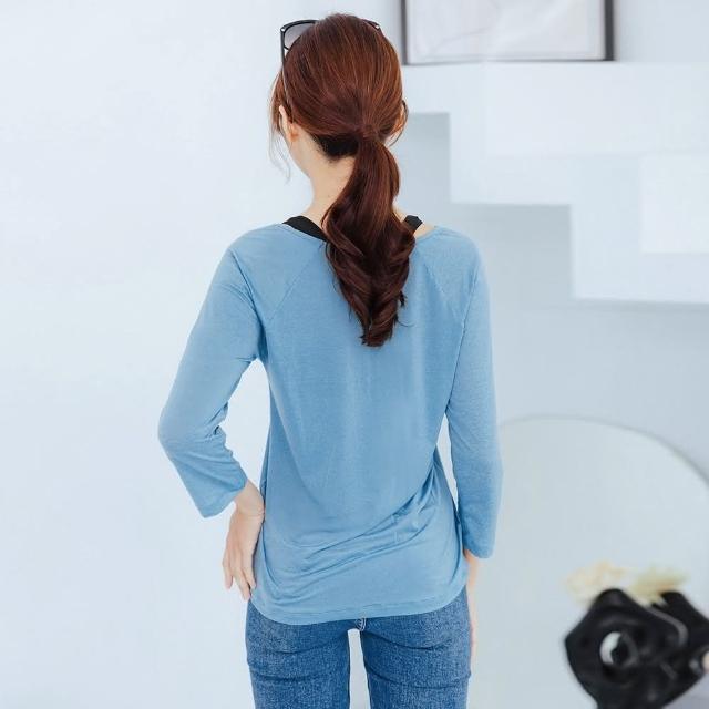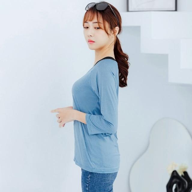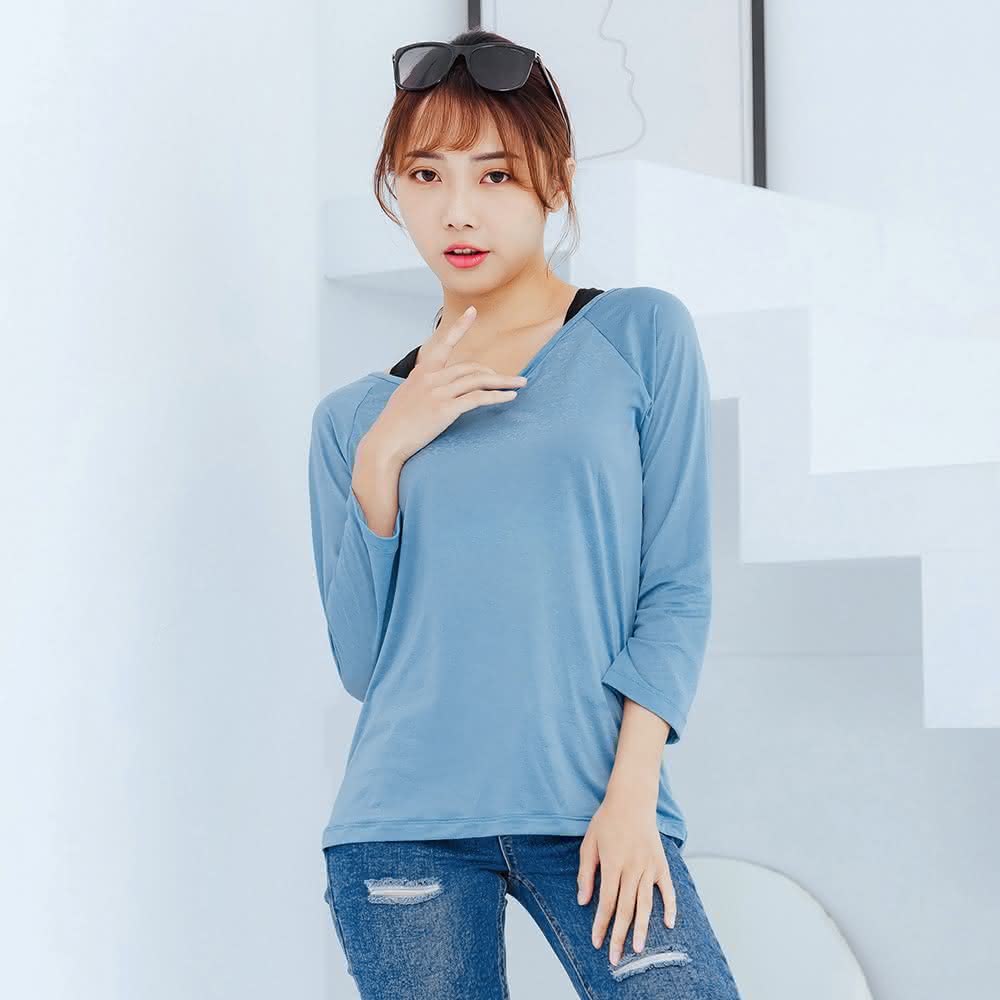 NEONER彈性顯瘦修身超輕薄七分袖圓領T恤-莫蘭迪藍(透氣、七分袖、外搭衣、輕薄上衣)