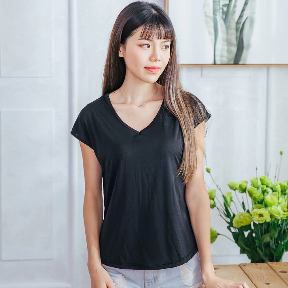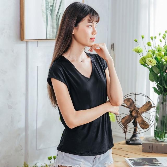 NEONER彈性顯瘦修身超細絲透氣包袖V領T恤-黑色(透氣、短袖、外搭衣、輕薄上衣、T恤)