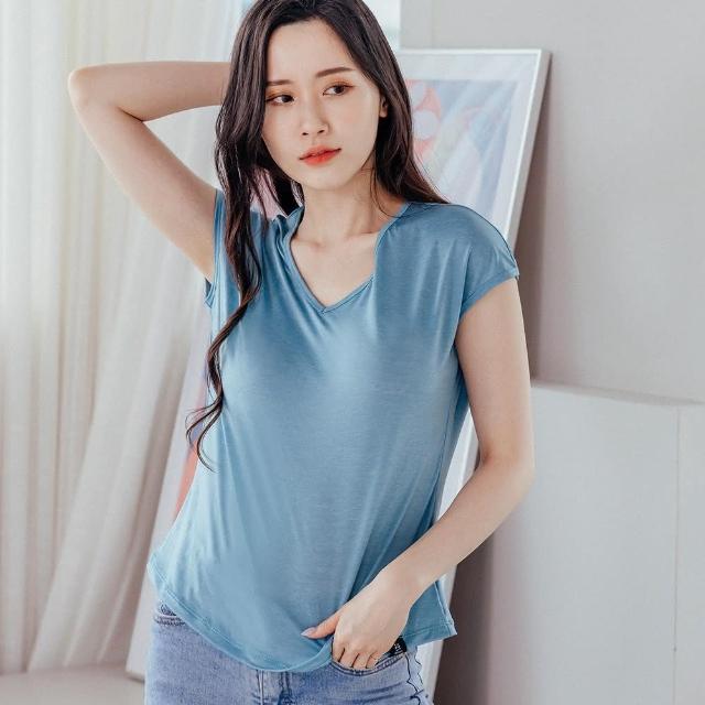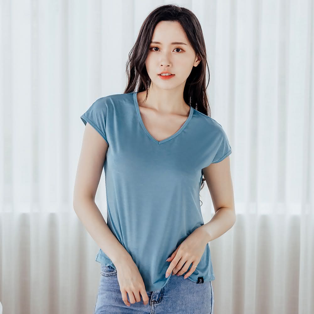 NEONER彈性顯瘦修身超細絲涼感包袖V領T恤-莫蘭迪藍(透氣、短袖、外搭衣、輕薄上衣、T恤)
