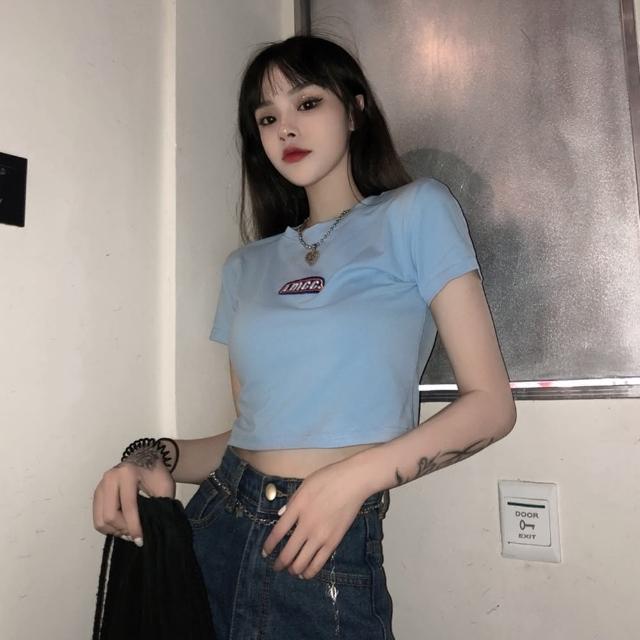 D.studio韓版字母黑色修身顯瘦短版上衣短袖上衣 短袖t恤 女裝 顯瘦上衣 衣服 T427