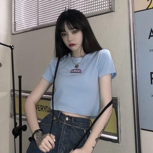 D.studio韓版字母黑色修身顯瘦短版上衣短袖上衣 短袖t恤 女裝 顯瘦上衣 衣服 T427