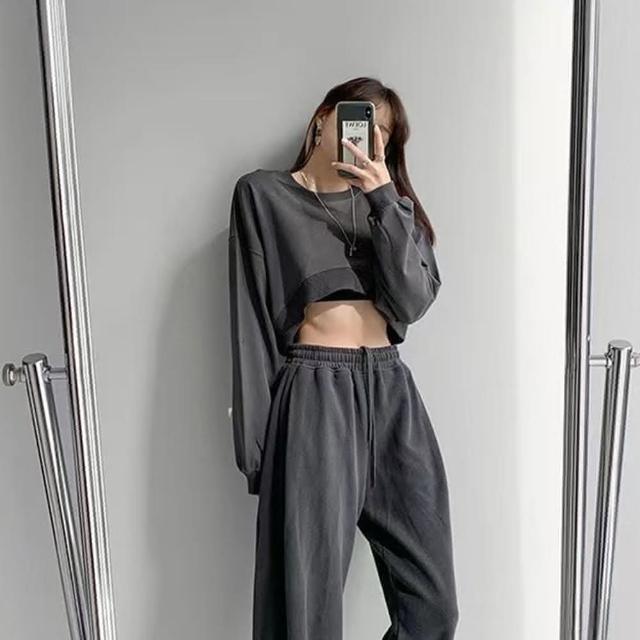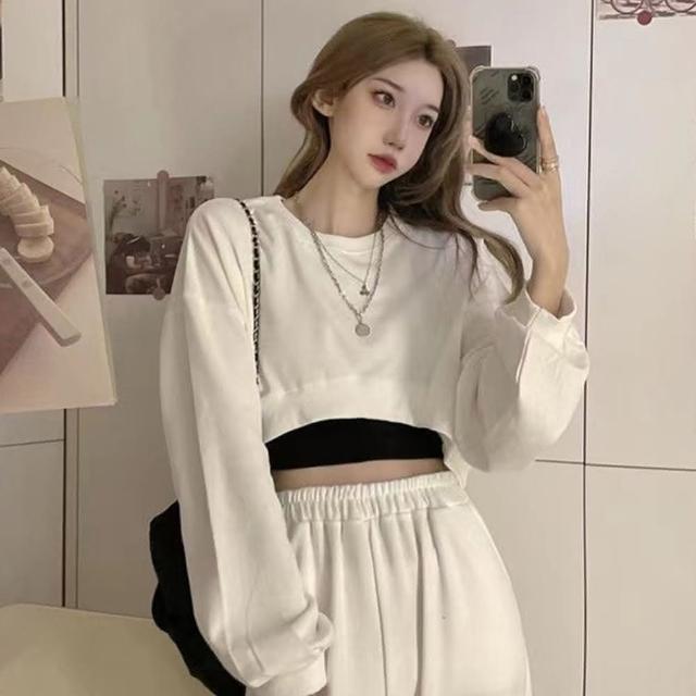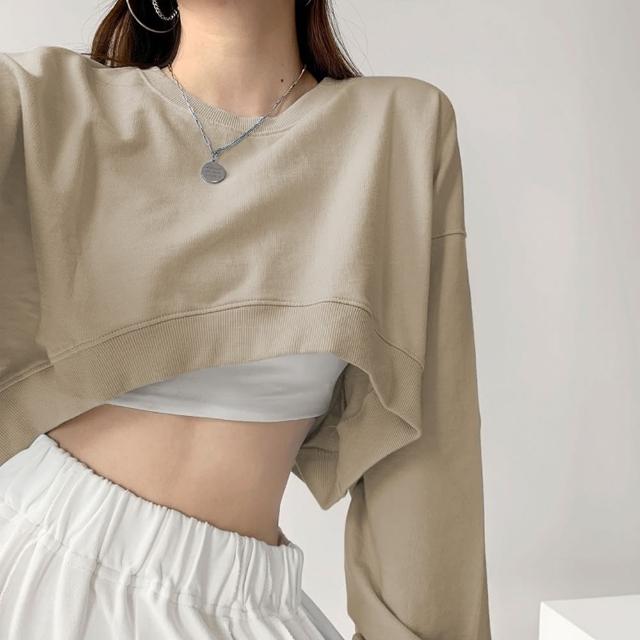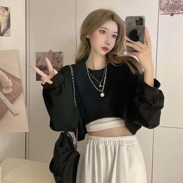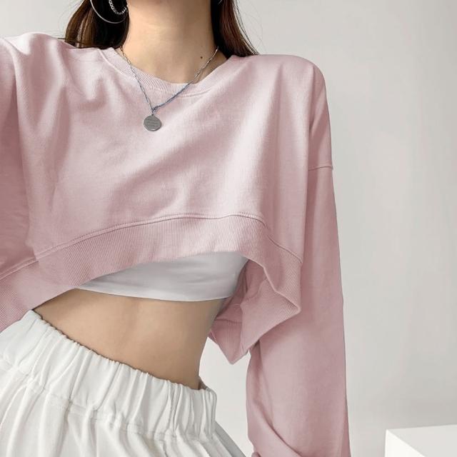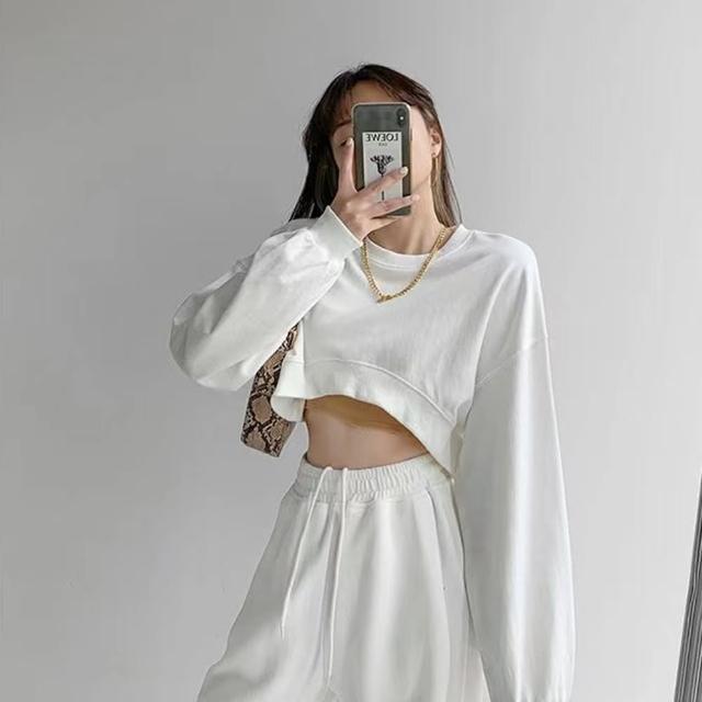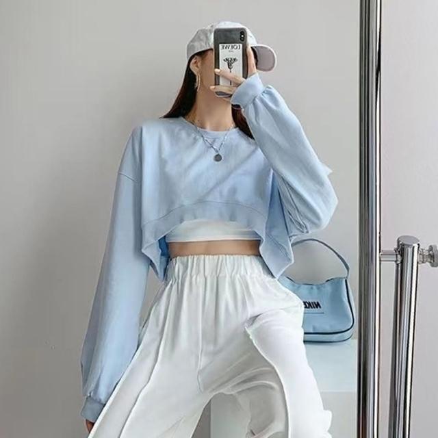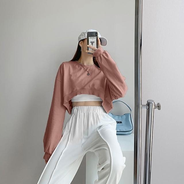 D.studio韓版小眾正肩設計感短版上衣長袖上衣 女裝 衣服 寬鬆上衣 顯瘦上衣 長袖t恤 冬裝 素T W203