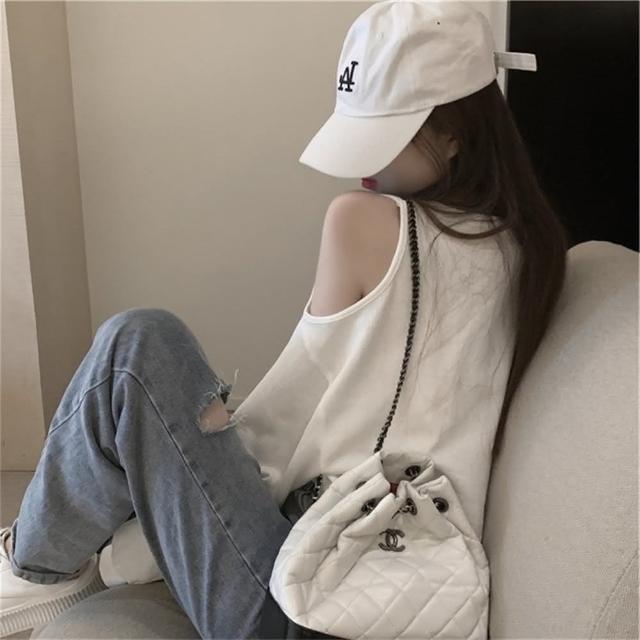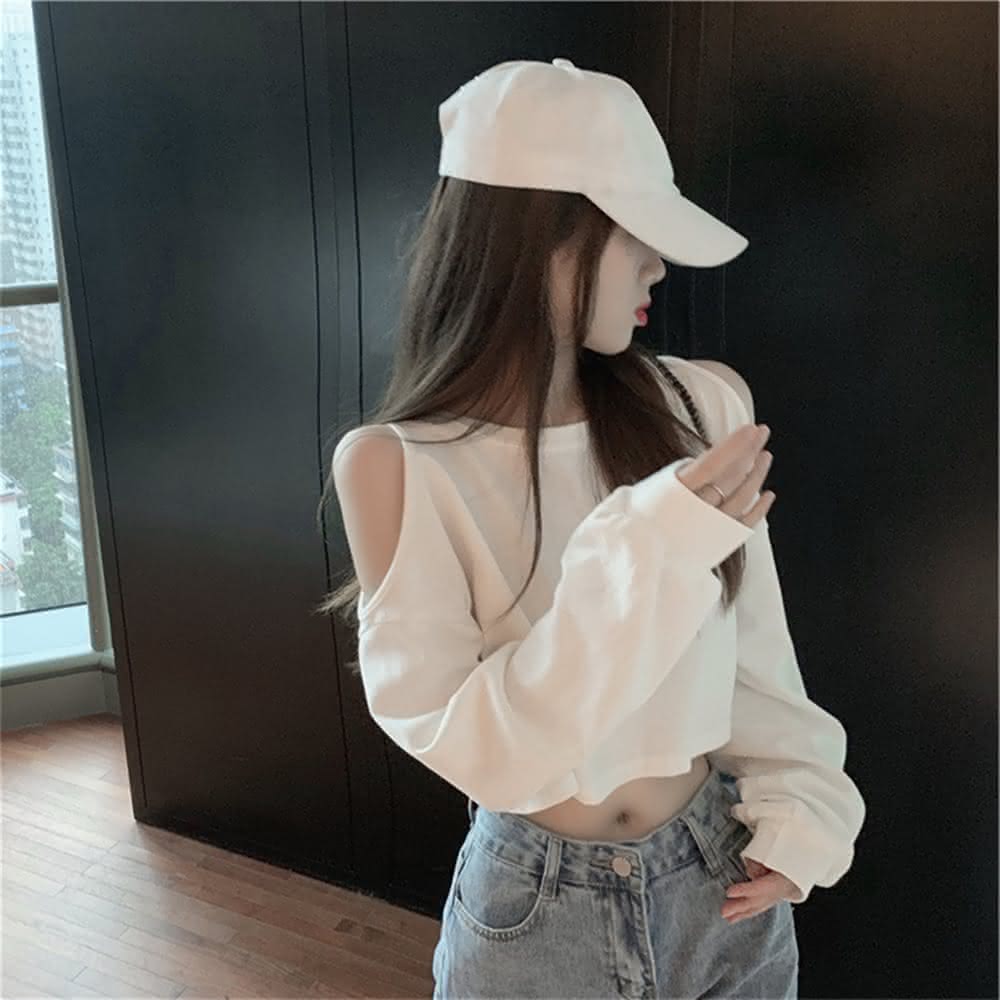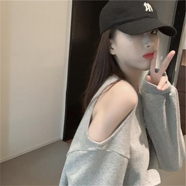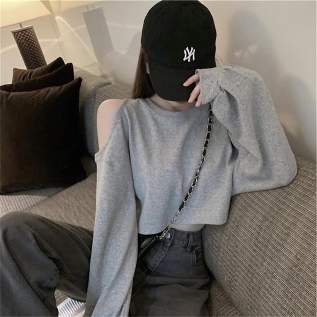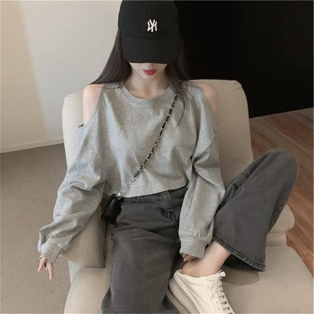 D.studio韓版露肩素色圓領短版長袖上衣女裝 衣服 寬鬆上衣 顯瘦上衣 素色 冬裝 長袖t恤 W205