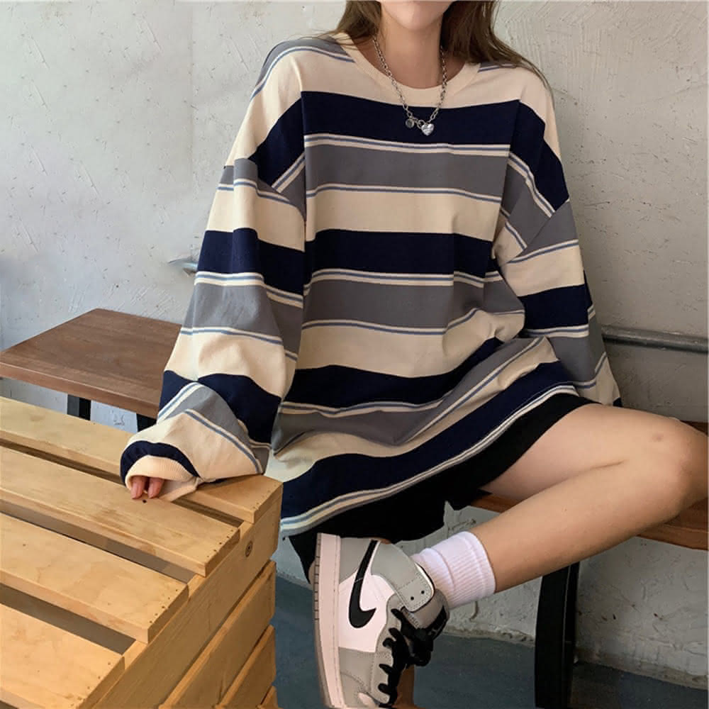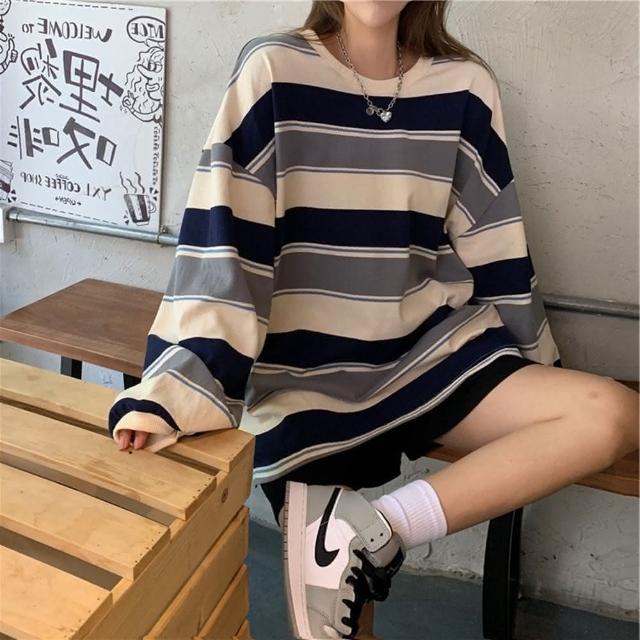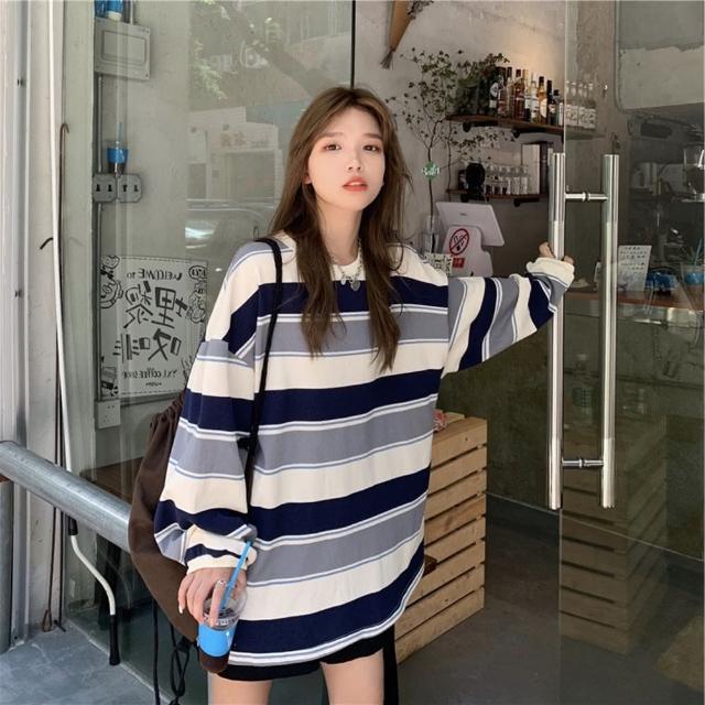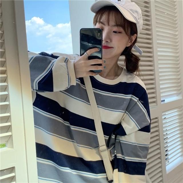 D.studio韓版寬條紋寬鬆圓領大學T長袖上衣 長袖t恤 女裝 衣服 寬鬆上衣 顯瘦上衣 W182