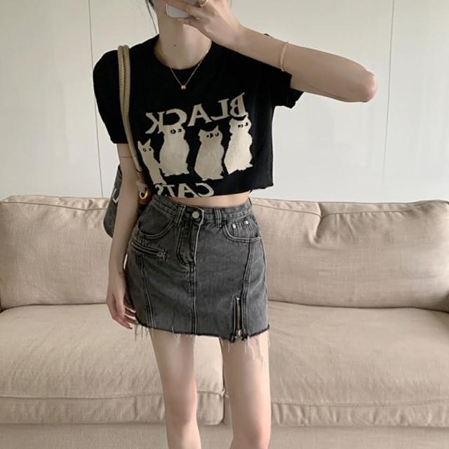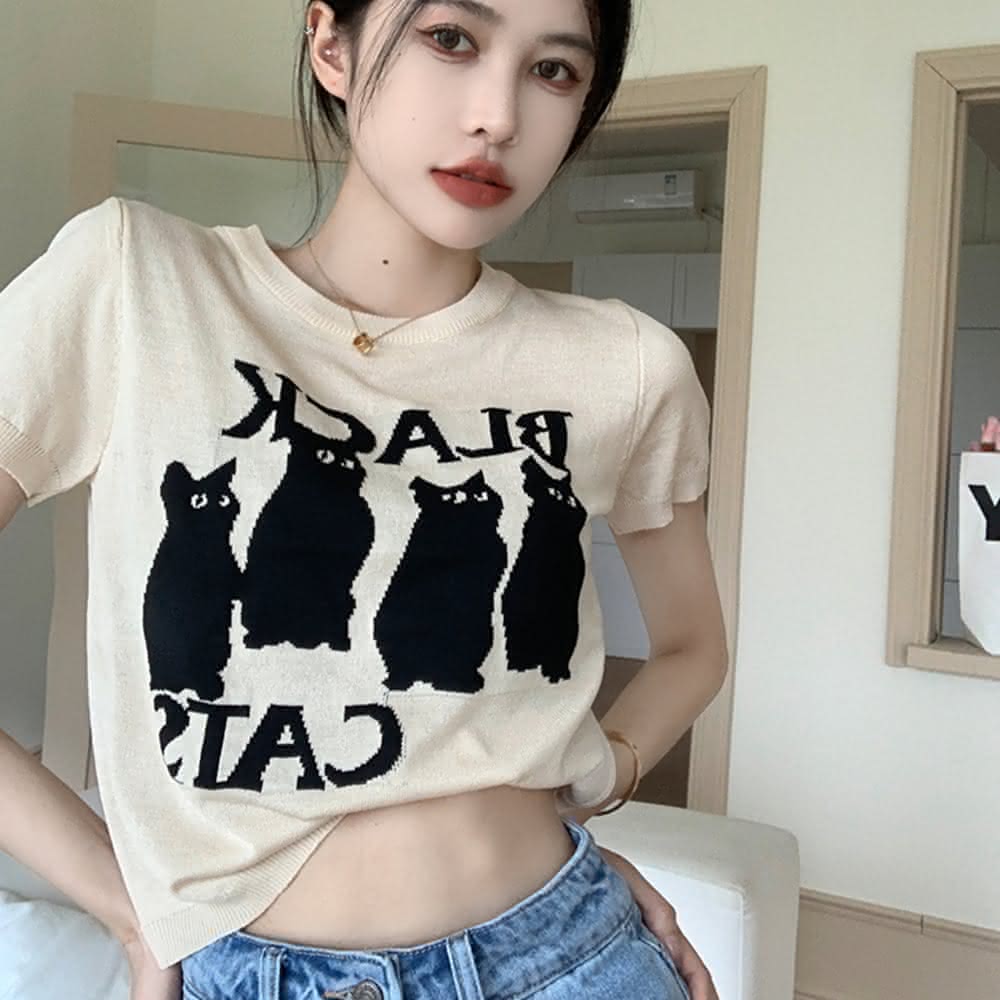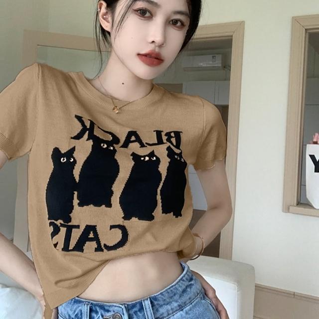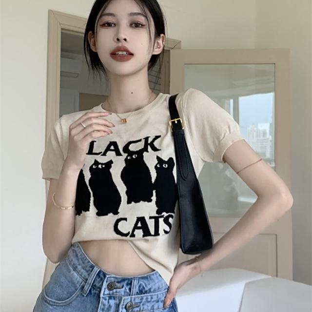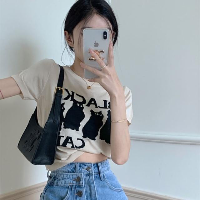 D.studio韓版甜酷風寬鬆貓咪針織上衣短袖上衣 短袖t恤 女裝 顯瘦上衣 衣服 寬鬆上衣 T518
