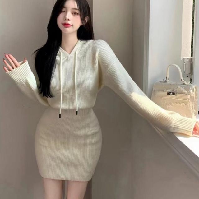 D.studio韓版修身顯瘦短裙連帽針織連衣裙套裝連身裙針織上衣毛衣長袖上衣女裝衣服裙子 S232