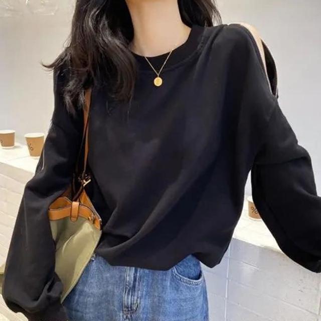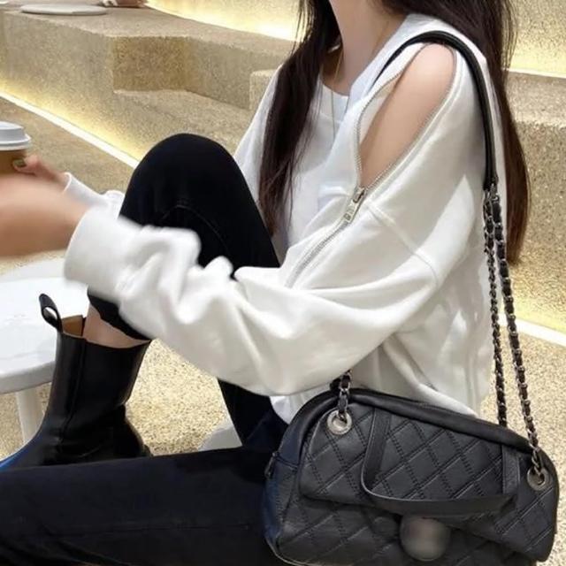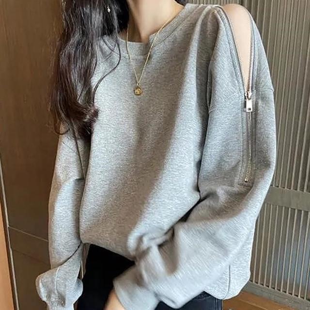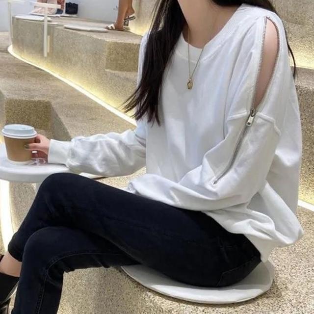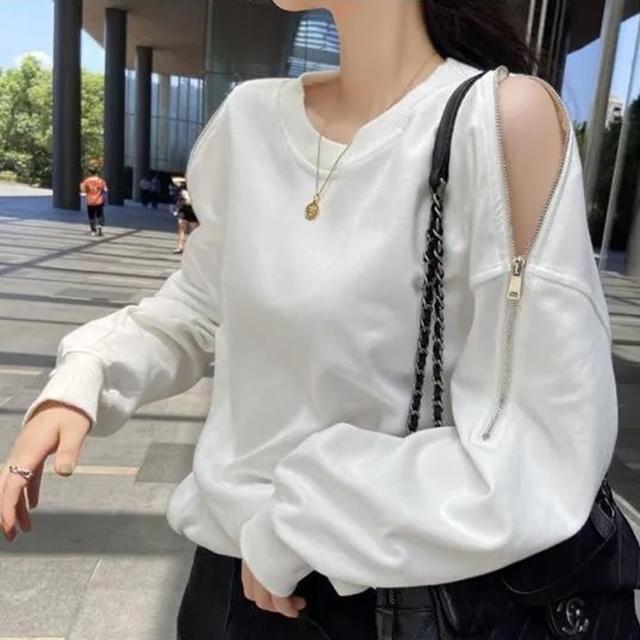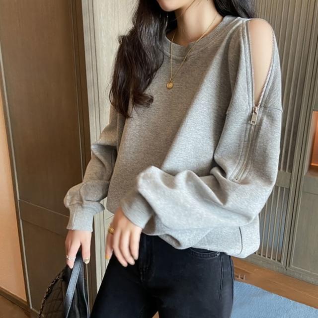 D.studio韓版設計感露肩拉鍊長袖上衣女裝 衣服 寬鬆上衣 顯瘦上衣 長袖t恤 W473