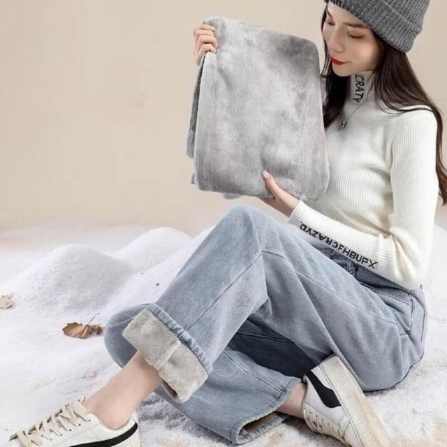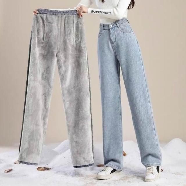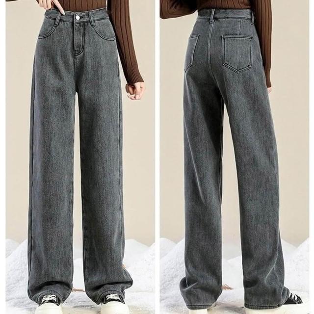 D.studio韓版加厚內刷毛高腰牛仔寬褲牛仔褲褲子長褲女裝高腰褲拖地褲直筒褲黑褲發熱褲保暖 P97