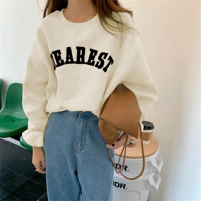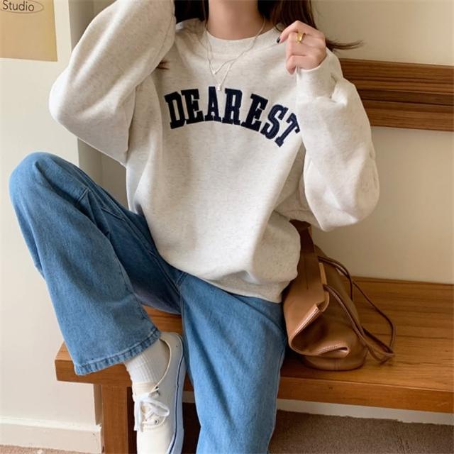 D.studio韓版刺繡字母內刷毛寬鬆長袖上衣女裝衣服寬鬆上衣顯瘦上衣長袖t恤大學T冬裝發熱衣 W500