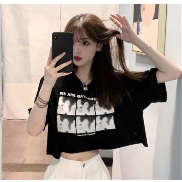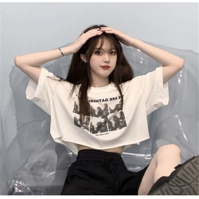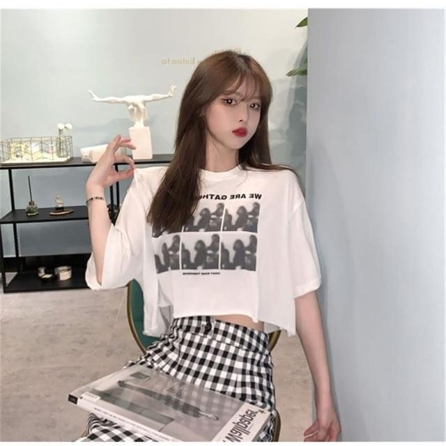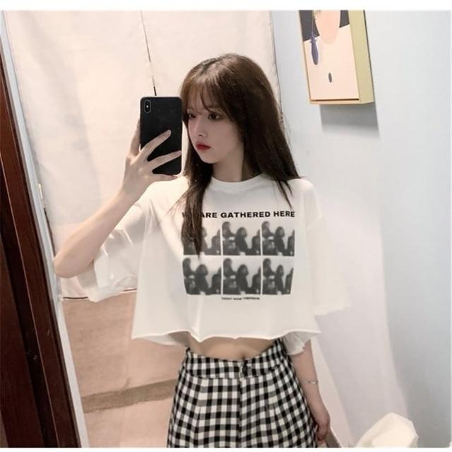 D.studio韓版修身小眾寬鬆高腰穿搭短版上衣短袖上衣短袖t恤女裝顯瘦上衣衣服寬鬆上衣短板上衣 T360