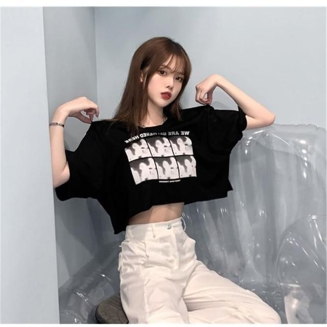 D.studio韓版修身小眾寬鬆高腰穿搭短版上衣短袖上衣短袖t恤女裝顯瘦上衣衣服寬鬆上衣短板上衣 T360