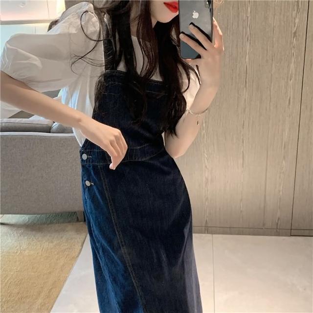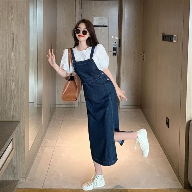 D.studio韓版休閒顯瘦氣質長版開叉牛仔吊帶裙連衣裙連身裙牛仔裙牛仔褲吊帶裙女裝衣服 裙子 S250