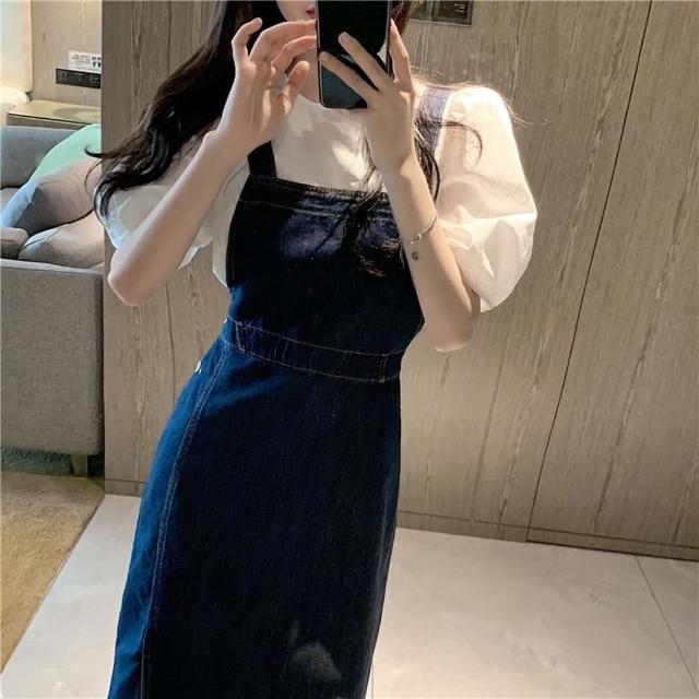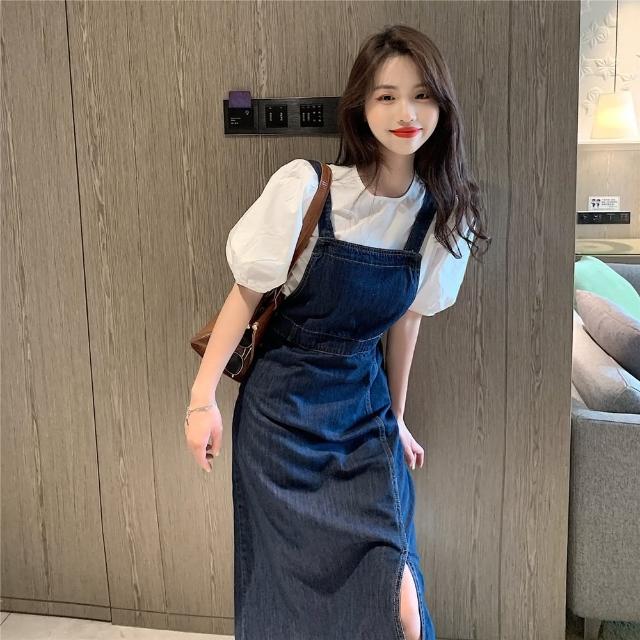 D.studio韓版休閒顯瘦氣質長版開叉牛仔吊帶裙連衣裙連身裙牛仔裙牛仔褲吊帶裙女裝衣服 裙子 S250