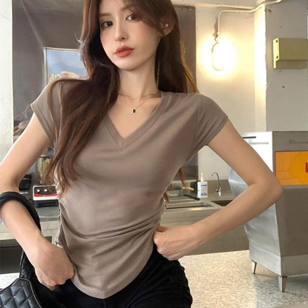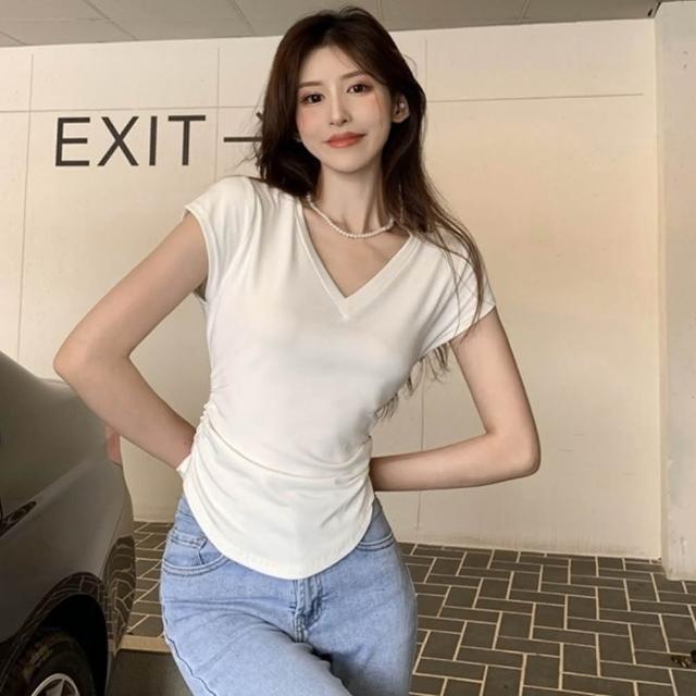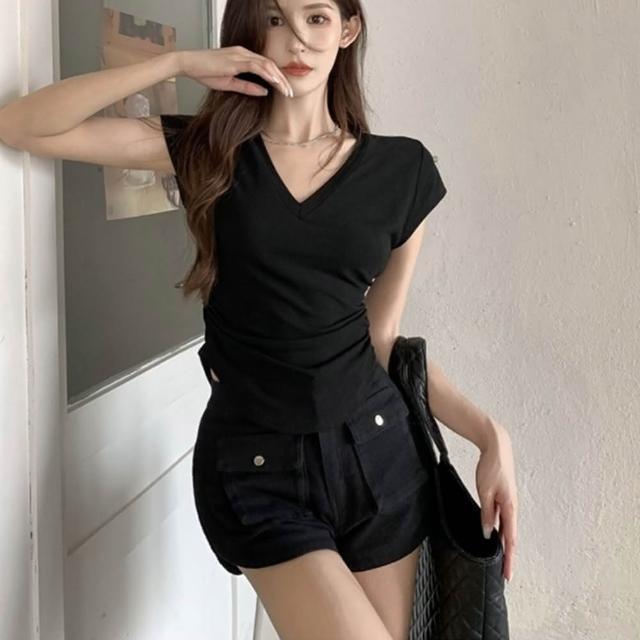 D.studio韓版顯瘦設計感V領素色短袖上衣短袖t恤 女裝 顯瘦上衣 衣服 寬鬆上衣 素T T524