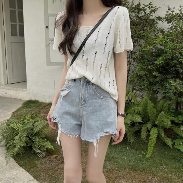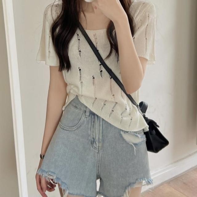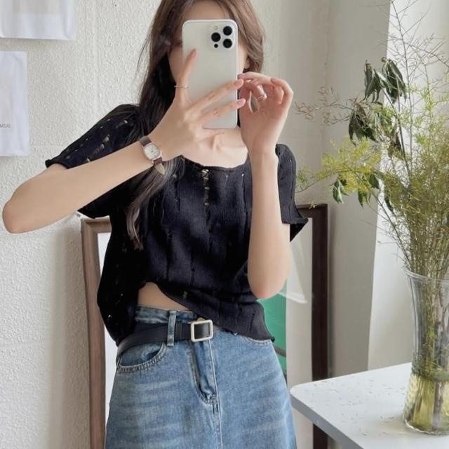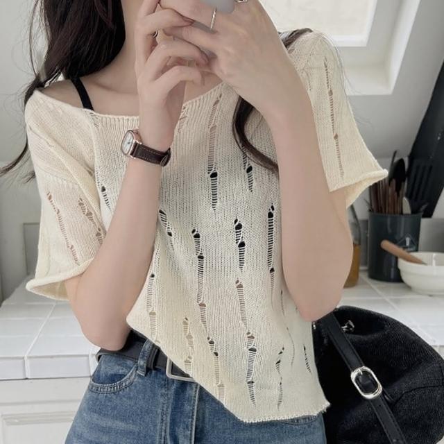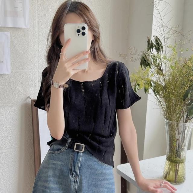 D.studio韓版小心機鏤空顯瘦針織上衣短袖上衣 短袖t恤 女裝 顯瘦上衣 衣服 寬鬆上衣 素T T563