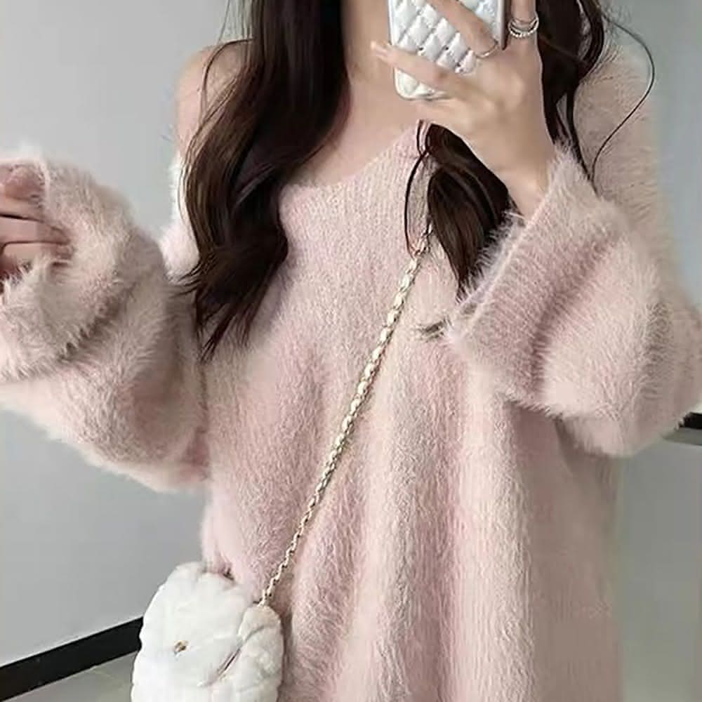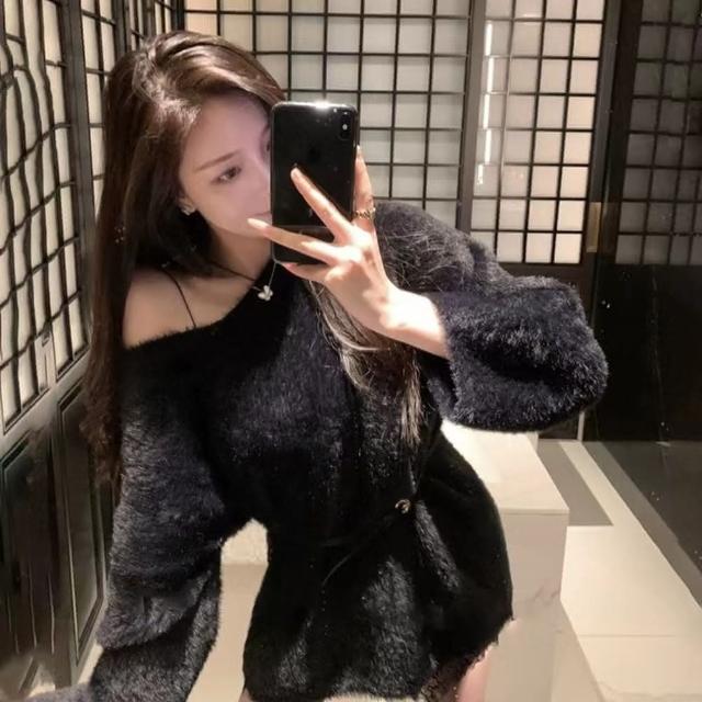 D.studio韓版寬鬆慵懶風V領一字領露肩毛衣長版上衣毛毛上衣針織上衣毛衣長袖上衣女裝衣服 W246